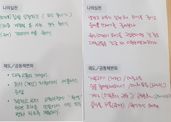 배달음식 문제, 음식물쓰레기 문제에도 함께 공감하였습니다. 마지막으로 이를 해결하기 위한 실천도 함께 작성하였습니다.