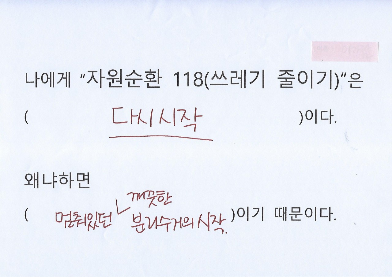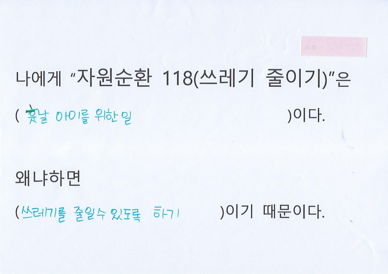 지난 2주일 간 매일 가정에서 배출되는 쓰레기의 양을 기록하고 줄여보는 실천을 함께 했는데요, 어린아이가 있는 가정들이어서 물티슈와 휴지, 기저귀 등의 쓰레기가 가장 많았다고 합니다. 쓰레기를 줄이는 것은 물론이고 인간의 소비에 대해 깊게 생각해본 지난 시간이었습니다.
