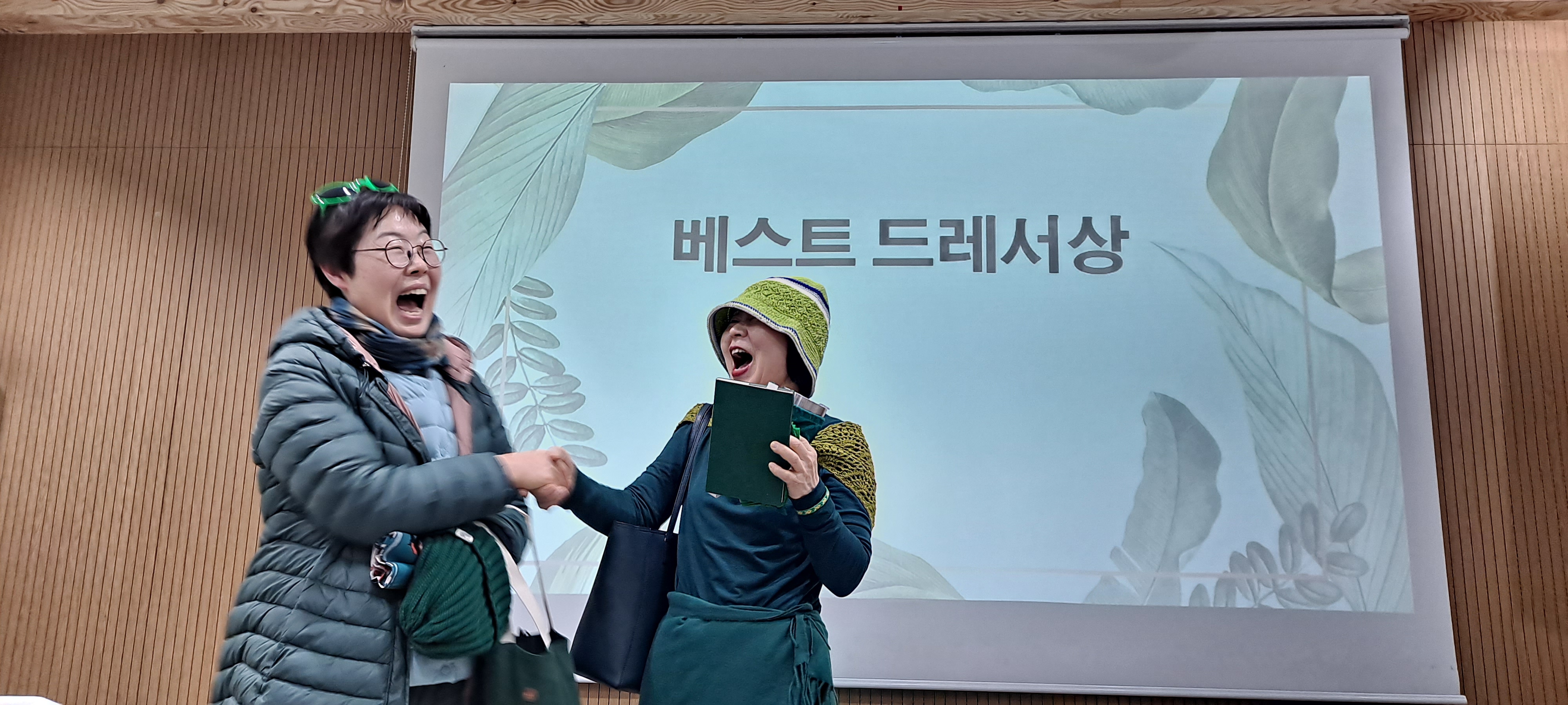 이번 총회 드레스코드는 [초록]이었습니다. 사진에서도 잘 보이시죠? 각각 12개씩의 초록 아이템을 착용하신 두 분께 베스트 드레서상도 드렸어요.