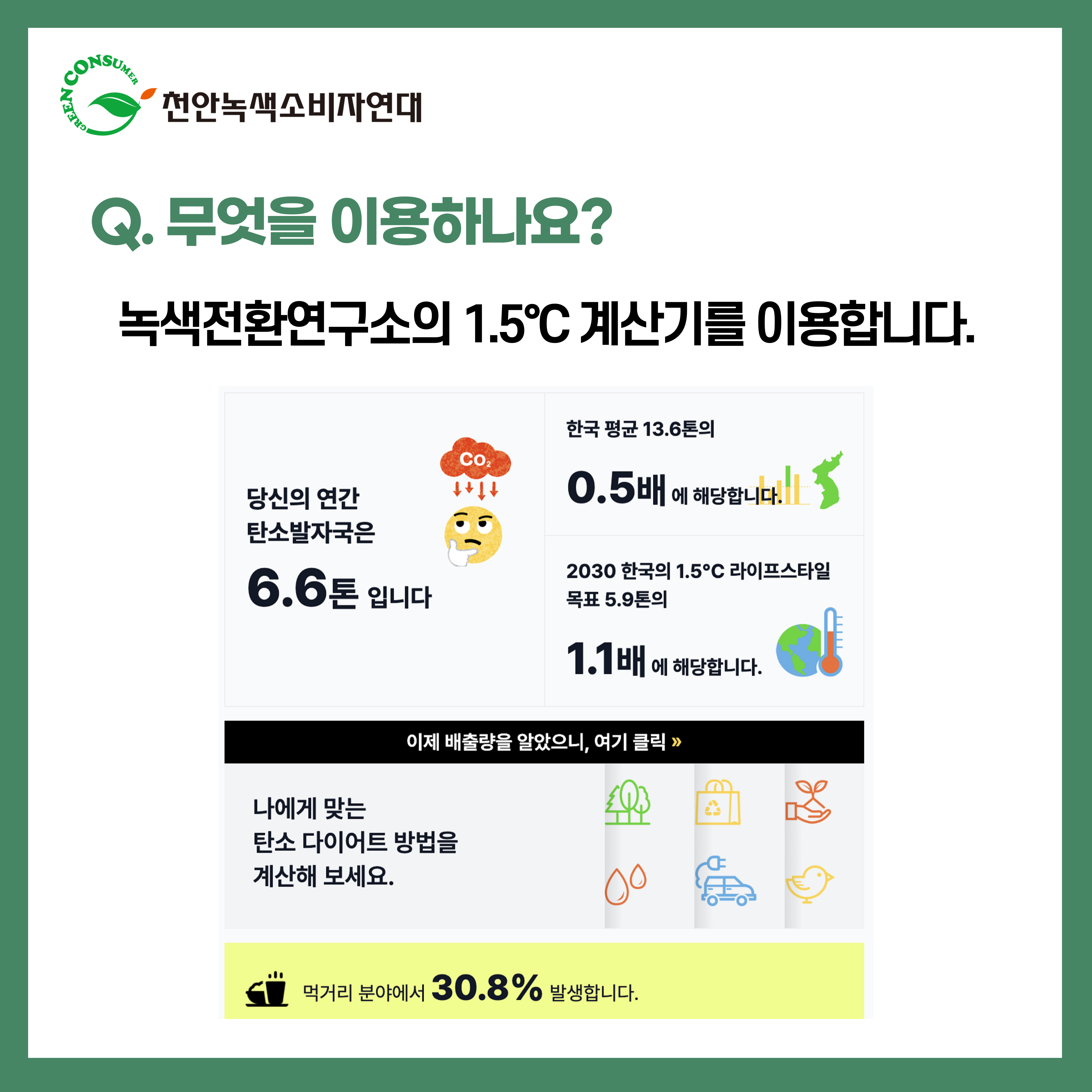나는 일주일에 자동차를 얼마나 운전하는지, 육식을 얼마나 하는지, 새로 구입한 물건은 몇 개인지 등등의 정보를 입력하면 개인의 탄소 배출량을 알려주는 [1.5도 계산기]가 있습니다. 이 계산기를 함께 두드려보고 어떻게 하면 생활 속 탄소 줄이기에 성공할 수 있는지 이야기 나누는 시간을 마련했습니다. 다섯 명 이상의 소규모 모임/동아리/학교 등등의 참여팀을 모집합니다. 많은 관심과 참여 부탁드립니다.