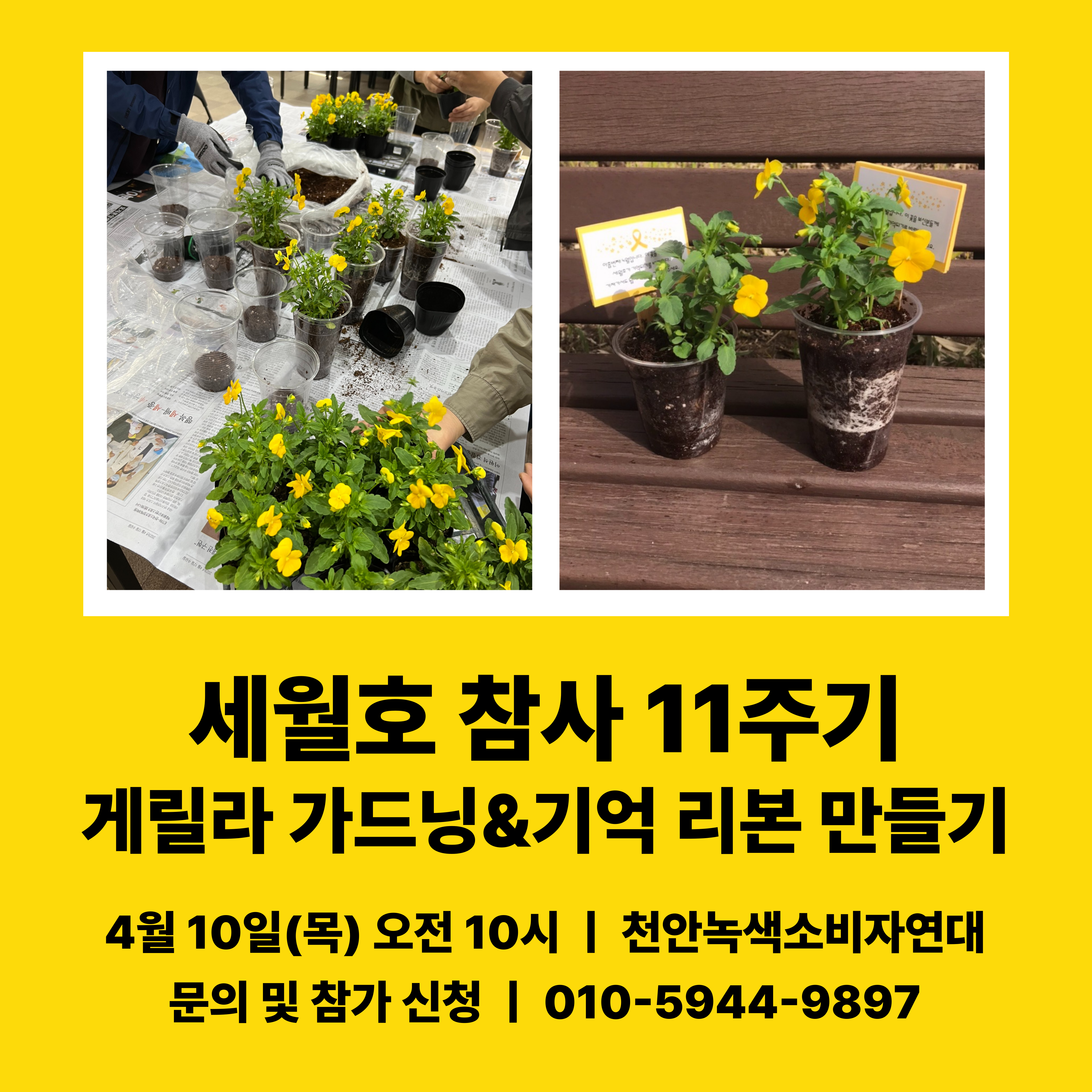 다가오는 세월호 11주기를 기억하기 위해 천안416 연대에서 [기억과 약속]이라는 시민행동 프로그램을 마련했습니다. 함께 기억하는 4월을 위해 천안녹색소비자연대에서도 게릴라 가드닝 화분 만들기와 기억 리본 만들기를 진행합니다.