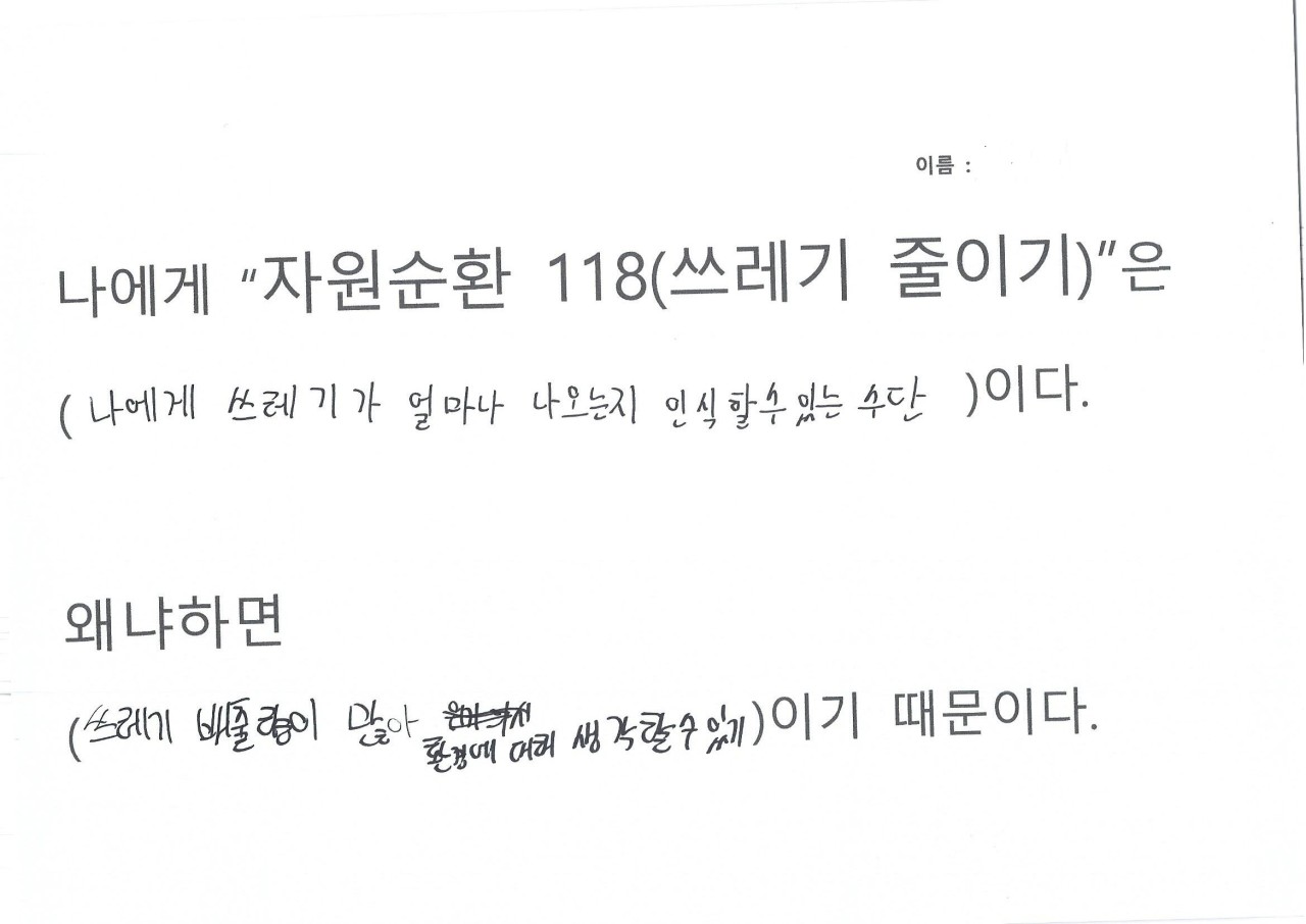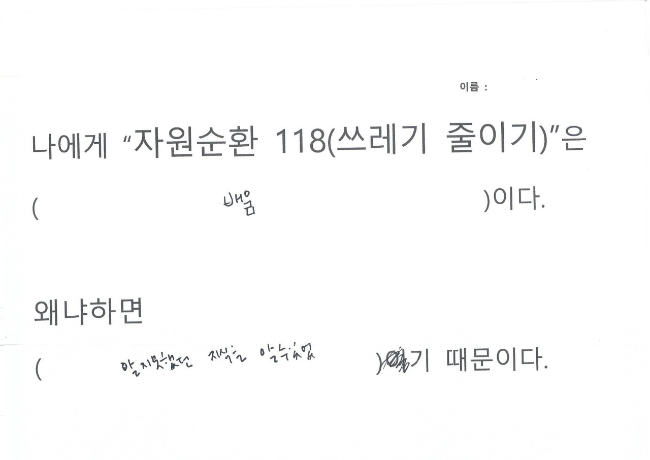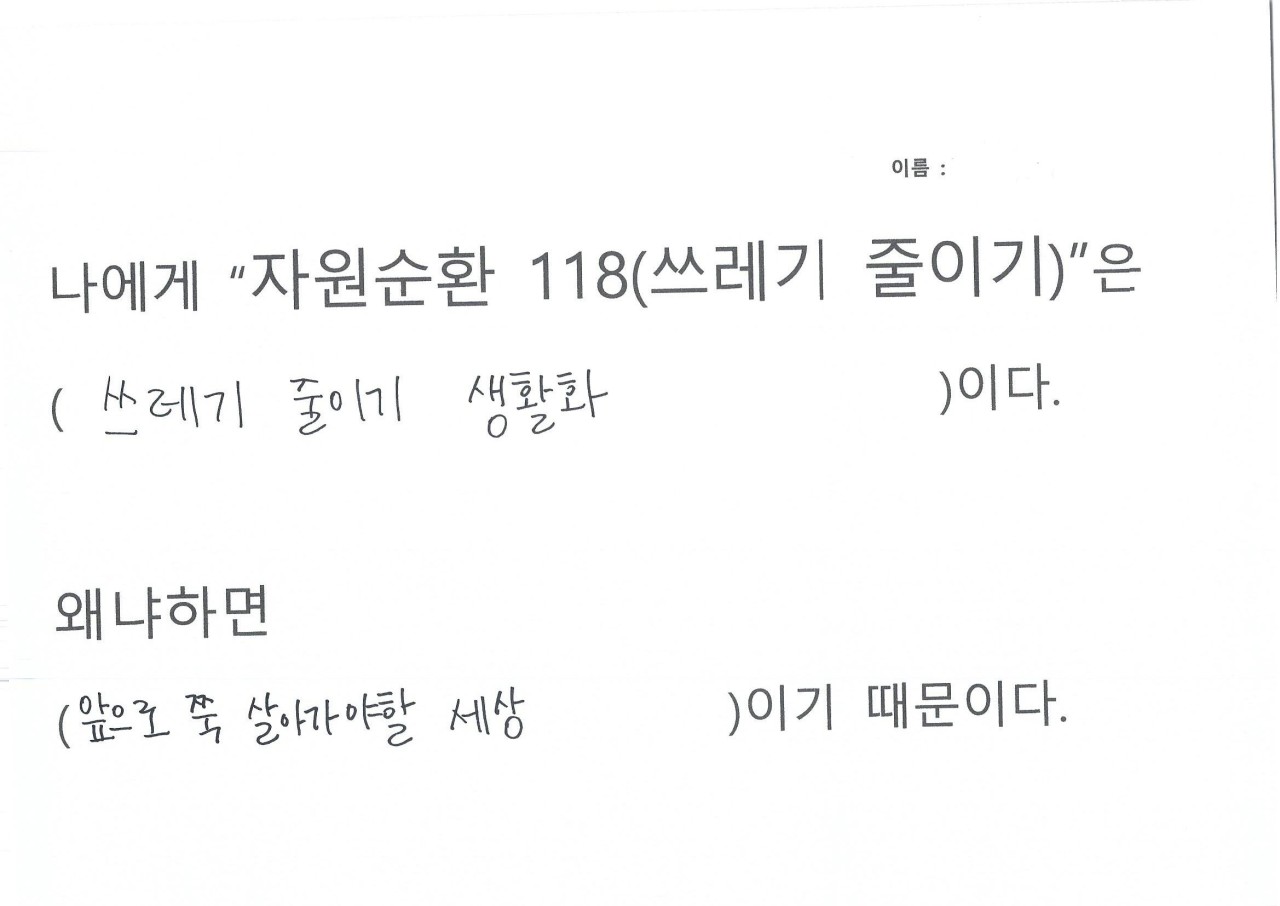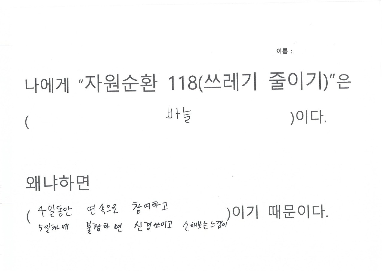 자원순환 118을 하면서 생활을 들여다보니 휴지를 너무 쓸데없이 많이 사용하는 것이 보여 줄였다, 평소에 배달음식을 자주 먹는데 활동하면서 일회용 용기가 너무 많이 사용하는 것이 보였다, 일회용컵 마실때마다 쓰레기가 인식되었다, 비닐 쓰레기가 너무 많이 나왔다, 물 티슈 사용이 많았다, 물건을 구입해보니 과대포장 제품이랑 포장 속 포장 제품이 많았다는 의견을 내주었습니다.