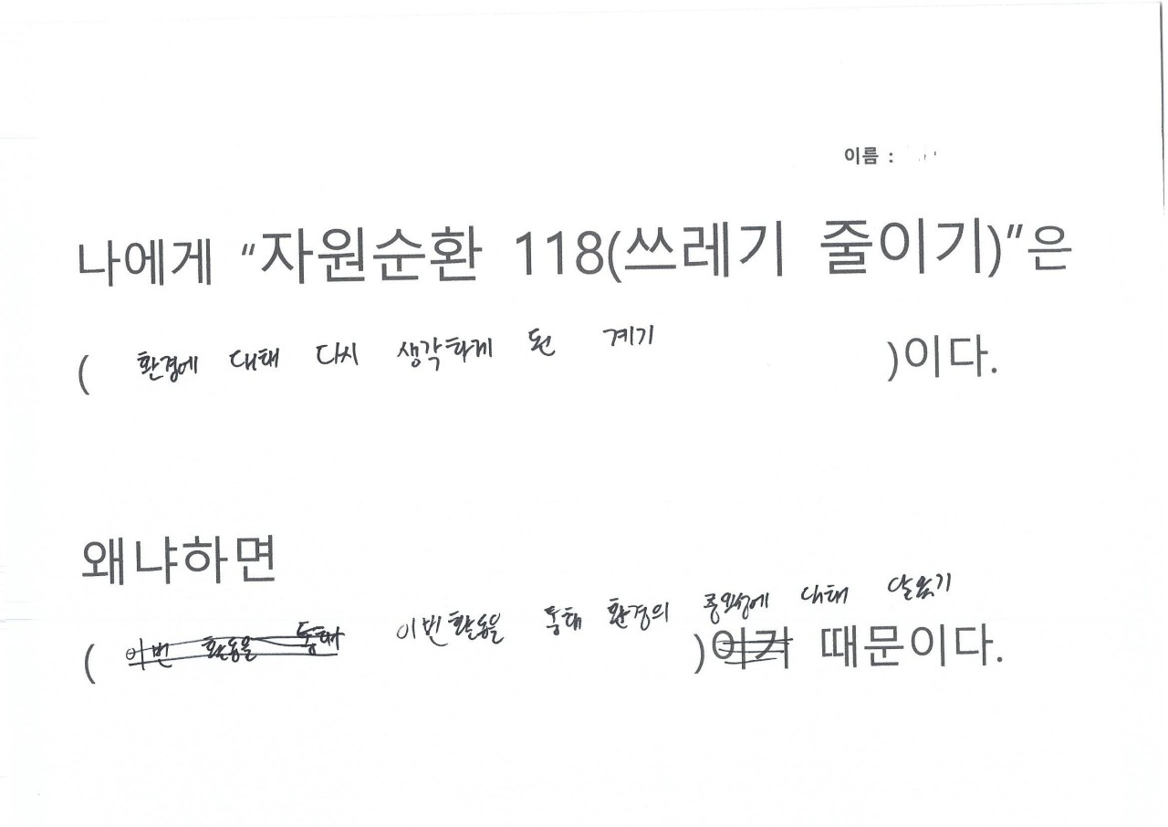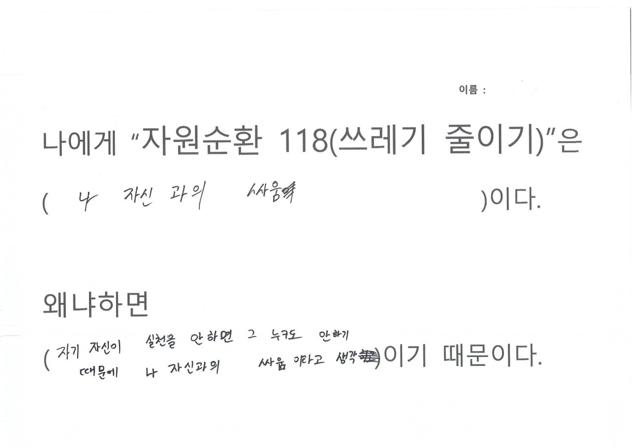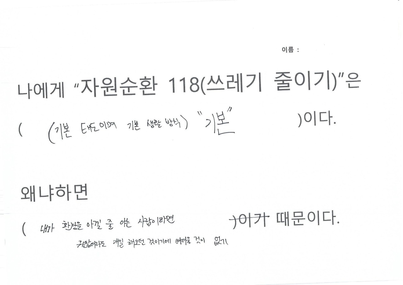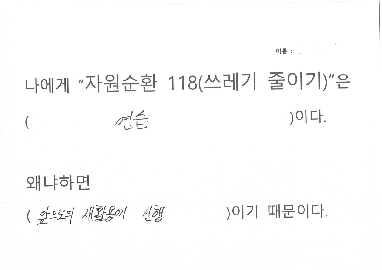 자원순환 118을 하면서 생활을 들여다보니 휴지를 너무 쓸데없이 많이 사용하는 것이 보여 줄였다, 평소에 배달음식을 자주 먹는데 활동하면서 일회용 용기가 너무 많이 사용하는 것이 보였다, 일회용컵 마실때마다 쓰레기가 인식되었다, 비닐 쓰레기가 너무 많이 나왔다, 물 티슈 사용이 많았다, 물건을 구입해보니 과대포장 제품이랑 포장 속 포장 제품이 많았다는 의견을 내주었습니다.