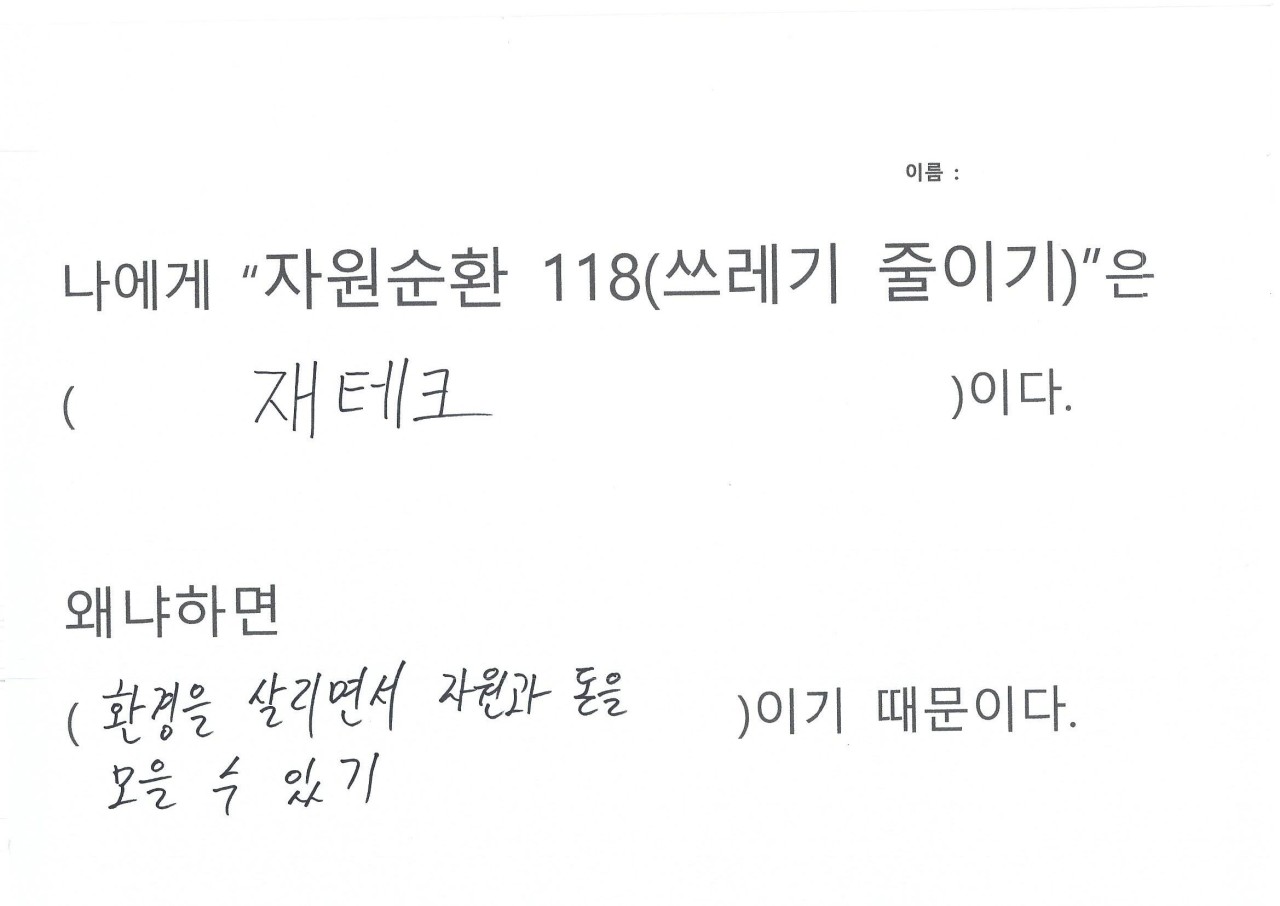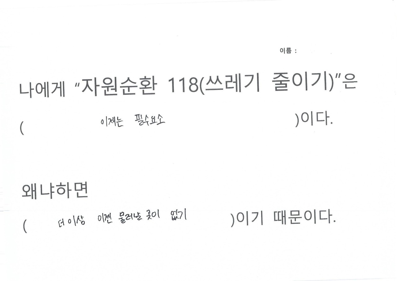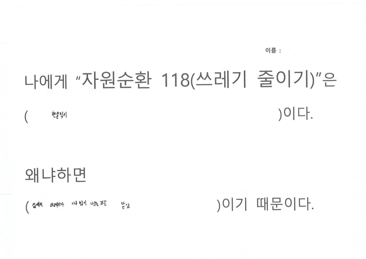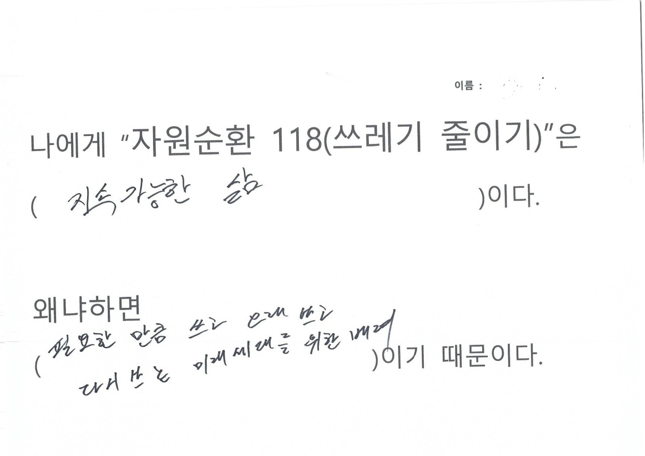 자원순환 118을 하면서 생활을 들여다보니 휴지를 너무 쓸데없이 많이 사용하는 것이 보여 줄였다, 평소에 배달음식을 자주 먹는데 활동하면서 일회용 용기가 너무 많이 사용하는 것이 보였다, 일회용컵 마실때마다 쓰레기가 인식되었다, 비닐 쓰레기가 너무 많이 나왔다, 물 티슈 사용이 많았다, 물건을 구입해보니 과대포장 제품이랑 포장 속 포장 제품이 많았다는 의견을 내주었습니다.