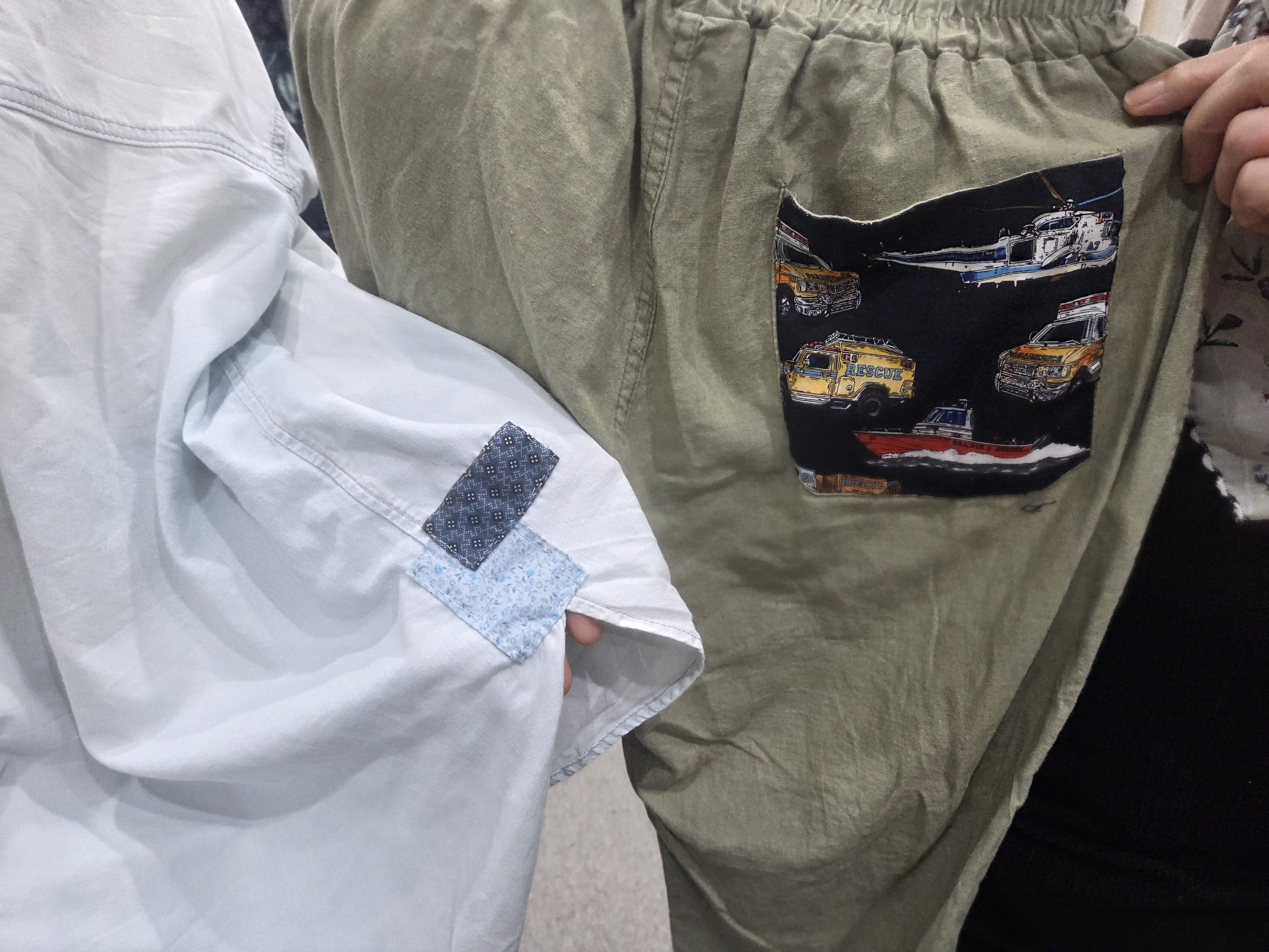 각자 가지고 온 온을 펼치고 노닥샘이 준비해온 다양한 색들의 원단을 선택, 옷 위에 덧대고 바느질을 시작하였습니다.