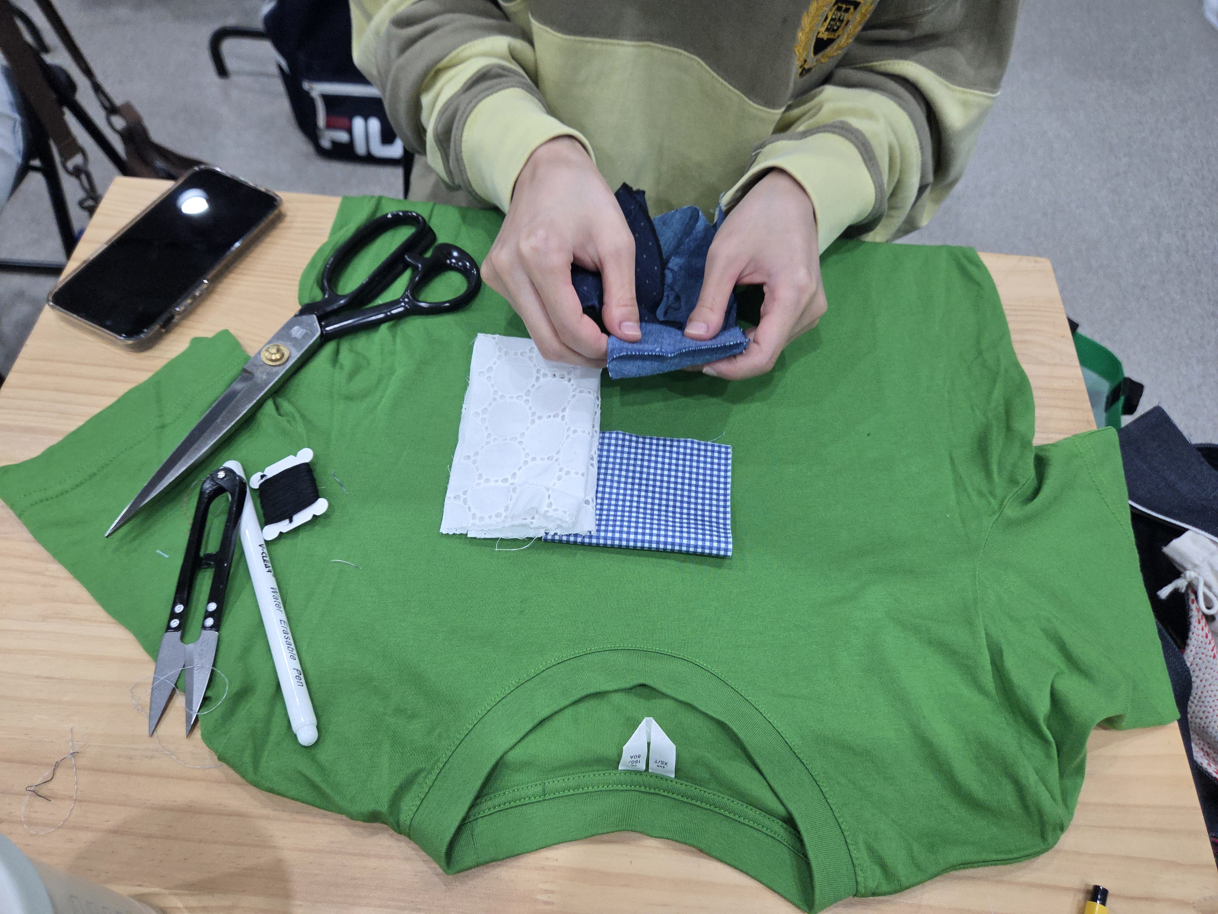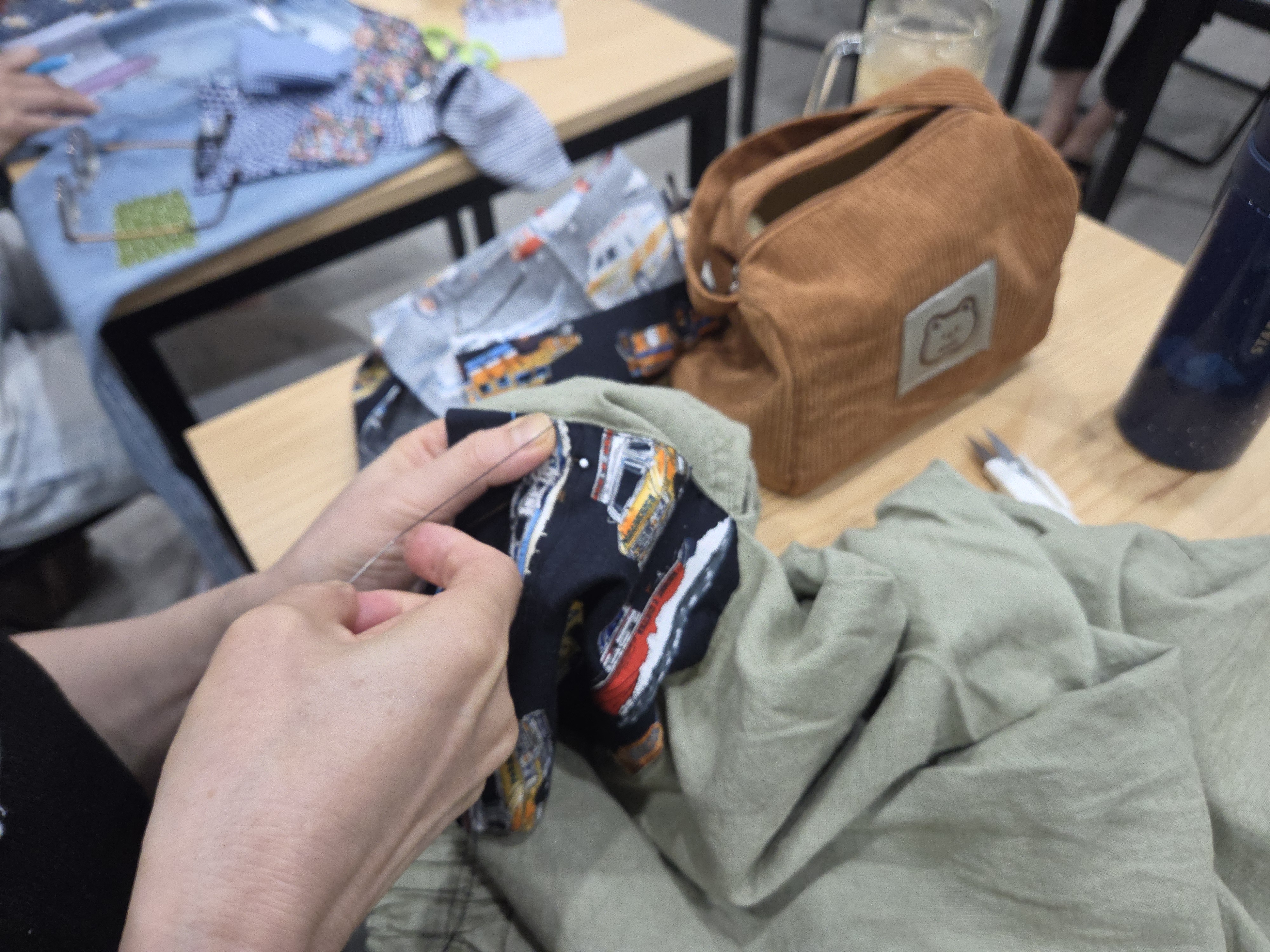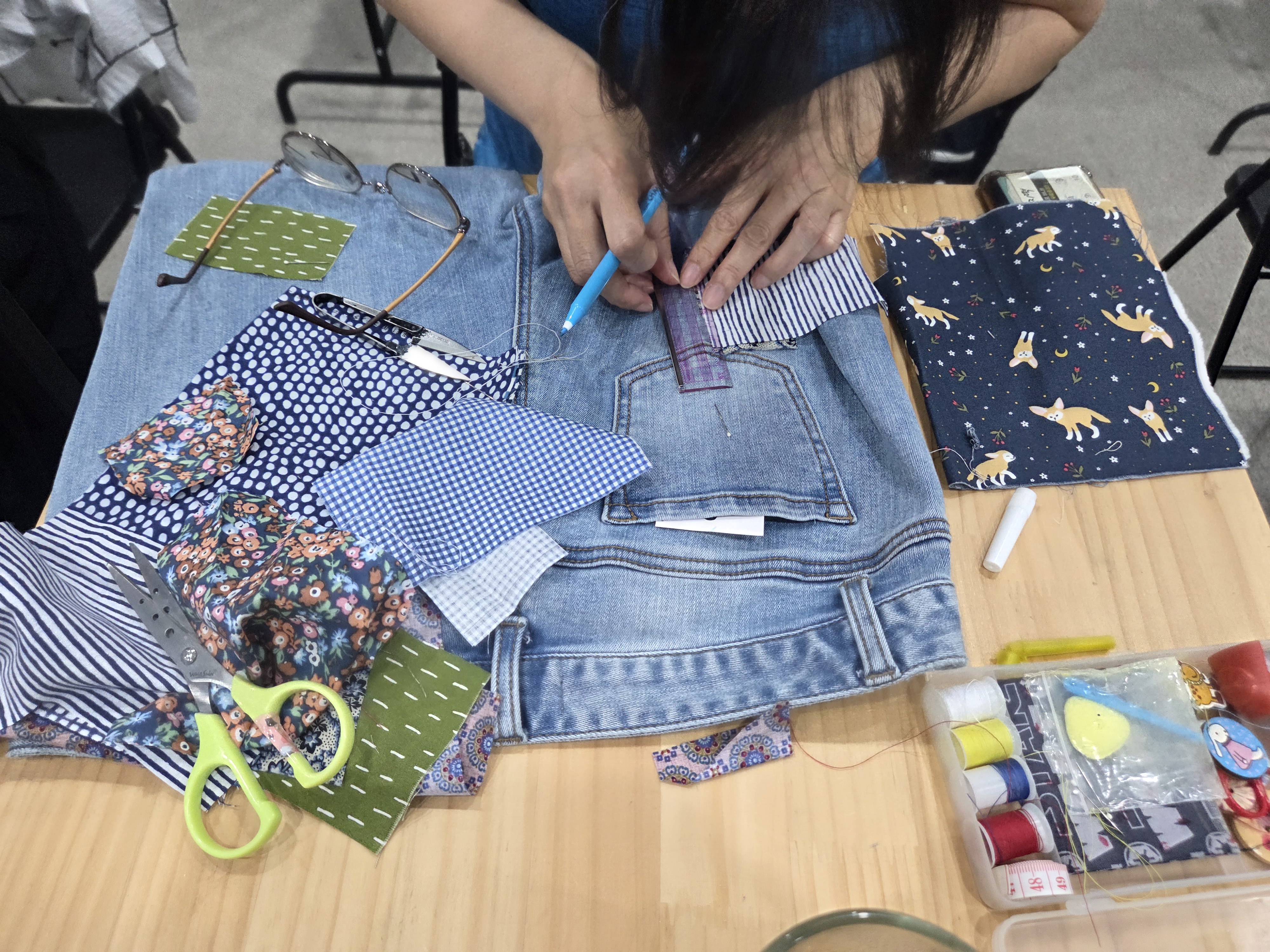각자 가지고 온 온을 펼치고 노닥샘이 준비해온 다양한 색들의 원단을 선택, 옷 위에 덧대고 바느질을 시작하였습니다.
