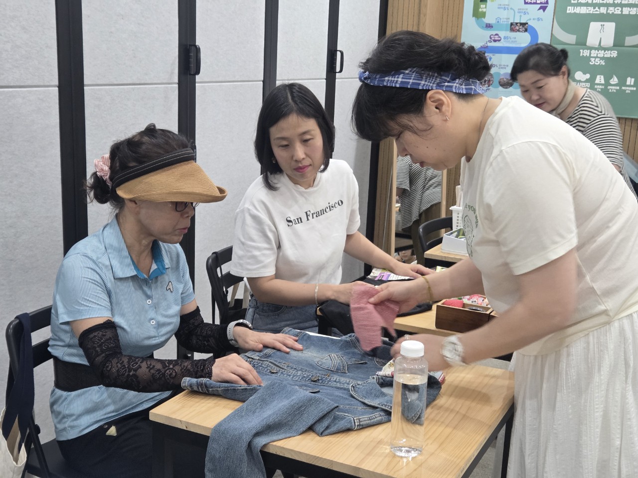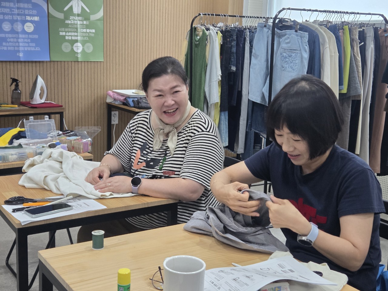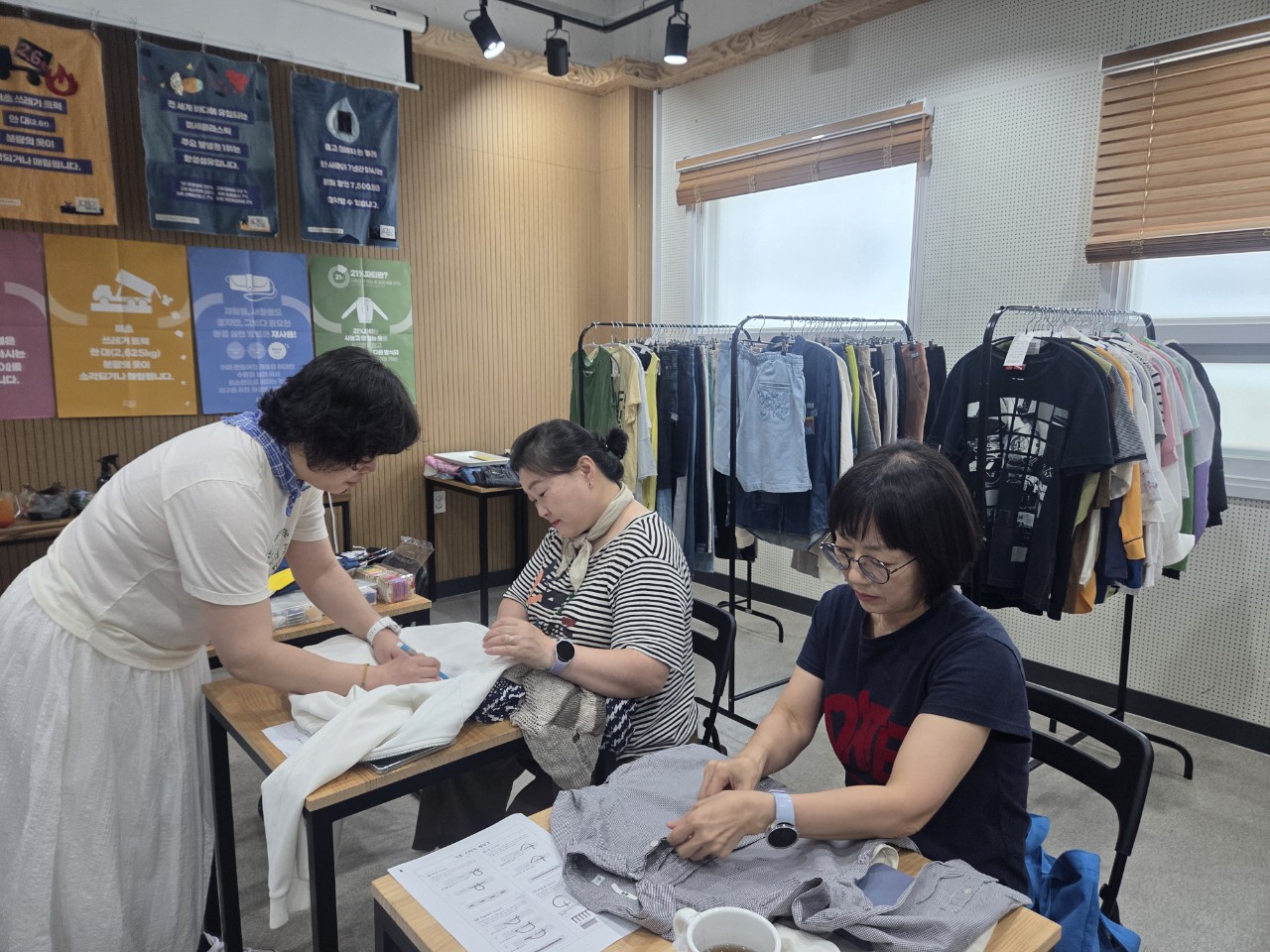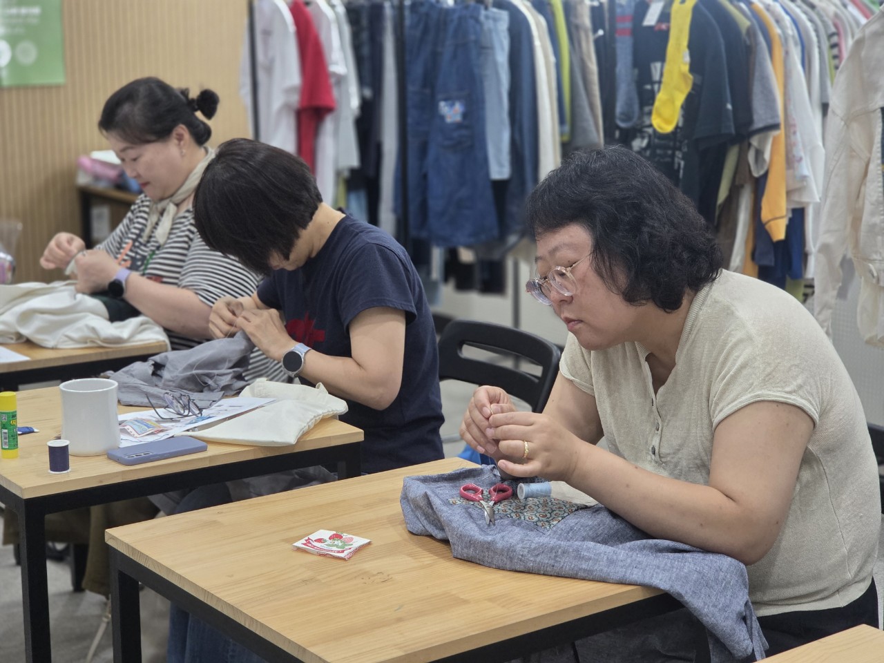 각자 가져온 옷들을 펼치고 바느질할 옷감을 진지하게 선택하여 바느질 시작.