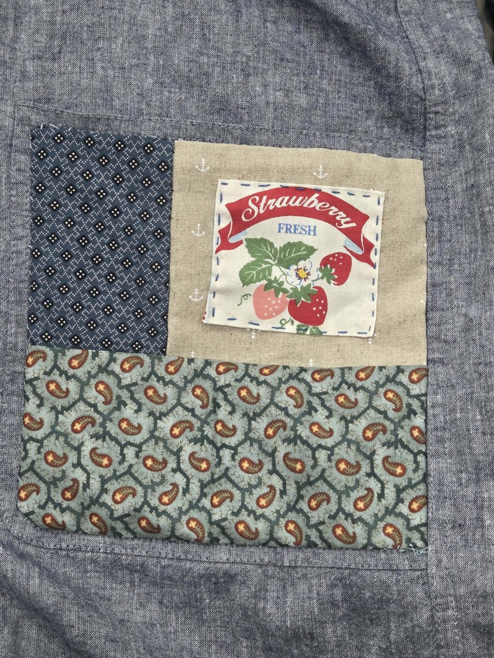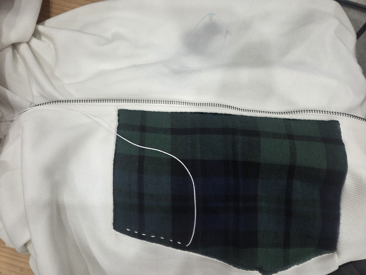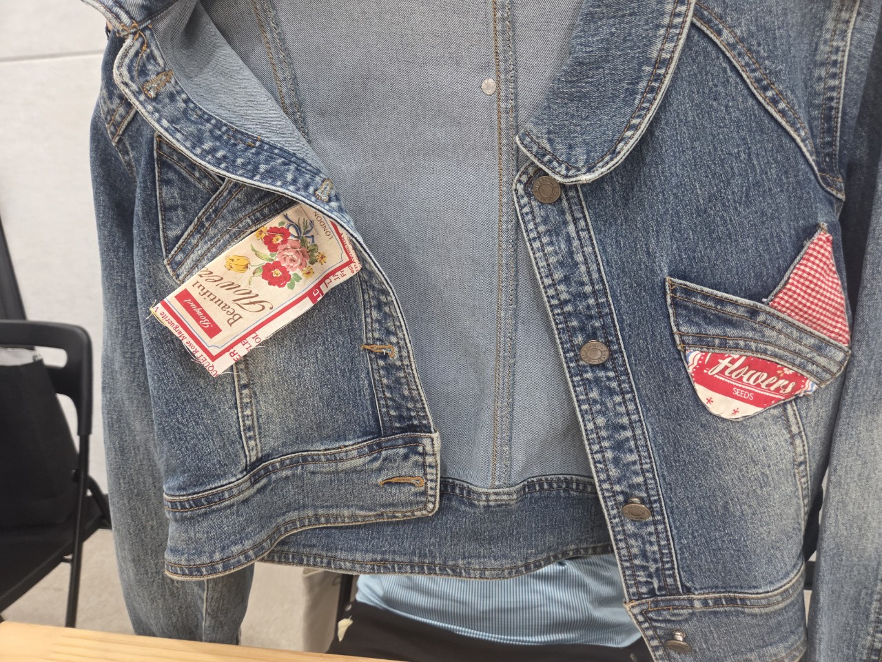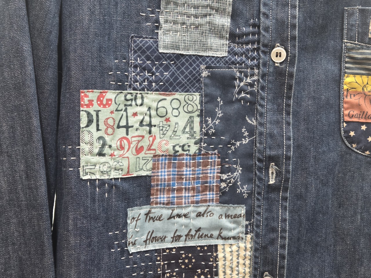 토요일인 26일 오전 10시에는 1강 조각 원단을 의류에 덧붙이기에 이어 보로스티치로 장식하기가 진행됩니다.(위 하얀 바느질이 보로스티치입니다.)
