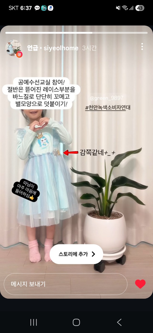딸래미 공주옷의 레이스에 큼지막한 별을 달아간 선생님의 기분좋은 인증샸에 저절로 웃음이 났고 서툰 바느질이지만 정성이 담긴 완성품에 모두들 박수를 쳤답니다.