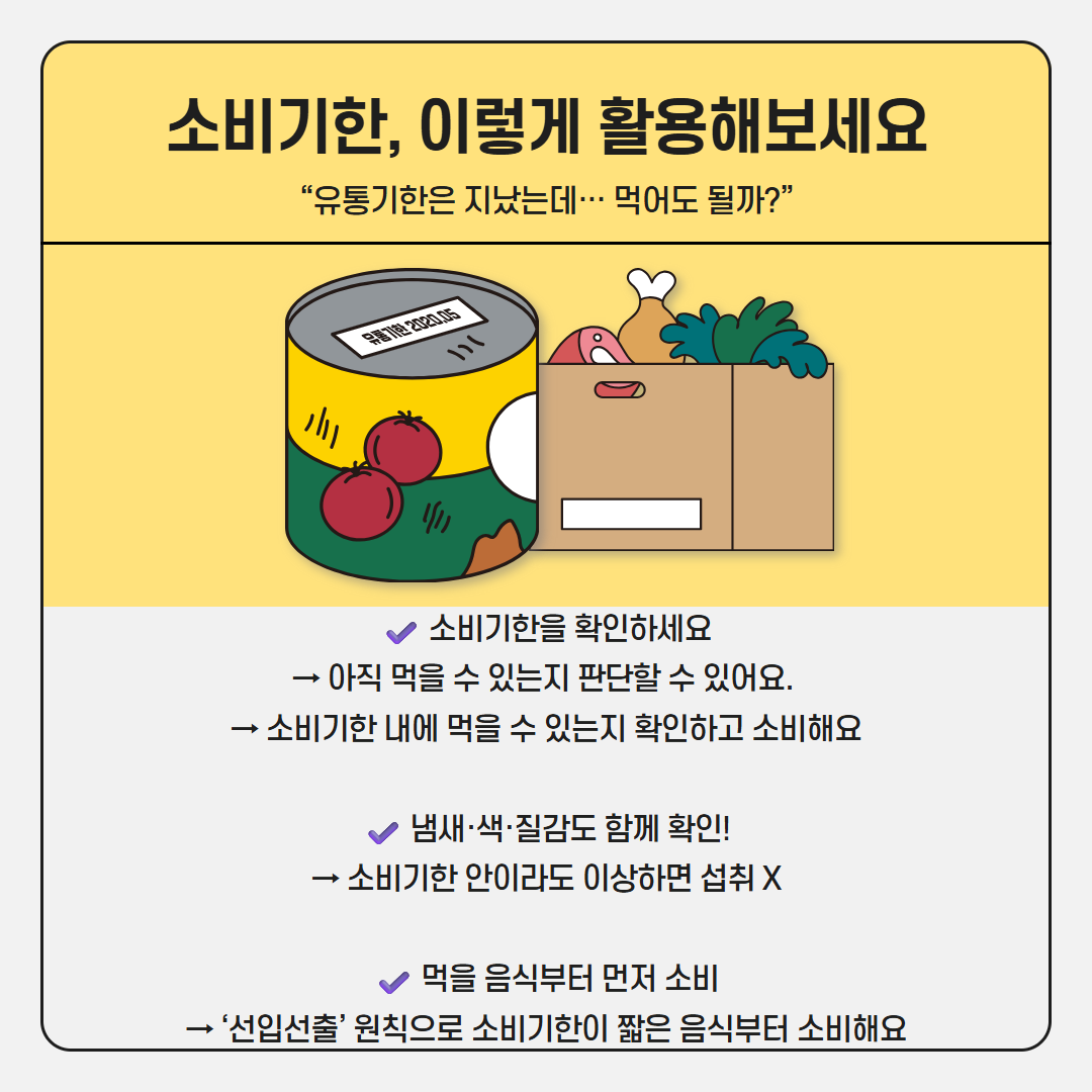 유통기한이 지나면 대부분의 식품이 버려지기 때문에 조리전 쓰레기로 음식물 쓰레기 문제가 심각하다는 사실, 모두 알고 계시지요? 이를 해결하기 위한 방안으로 식품이 실제로 먹을 수 있는 기한을 소비자의 입장에서 정한 '소비기한'이 2023년부터 시행되었습니다.