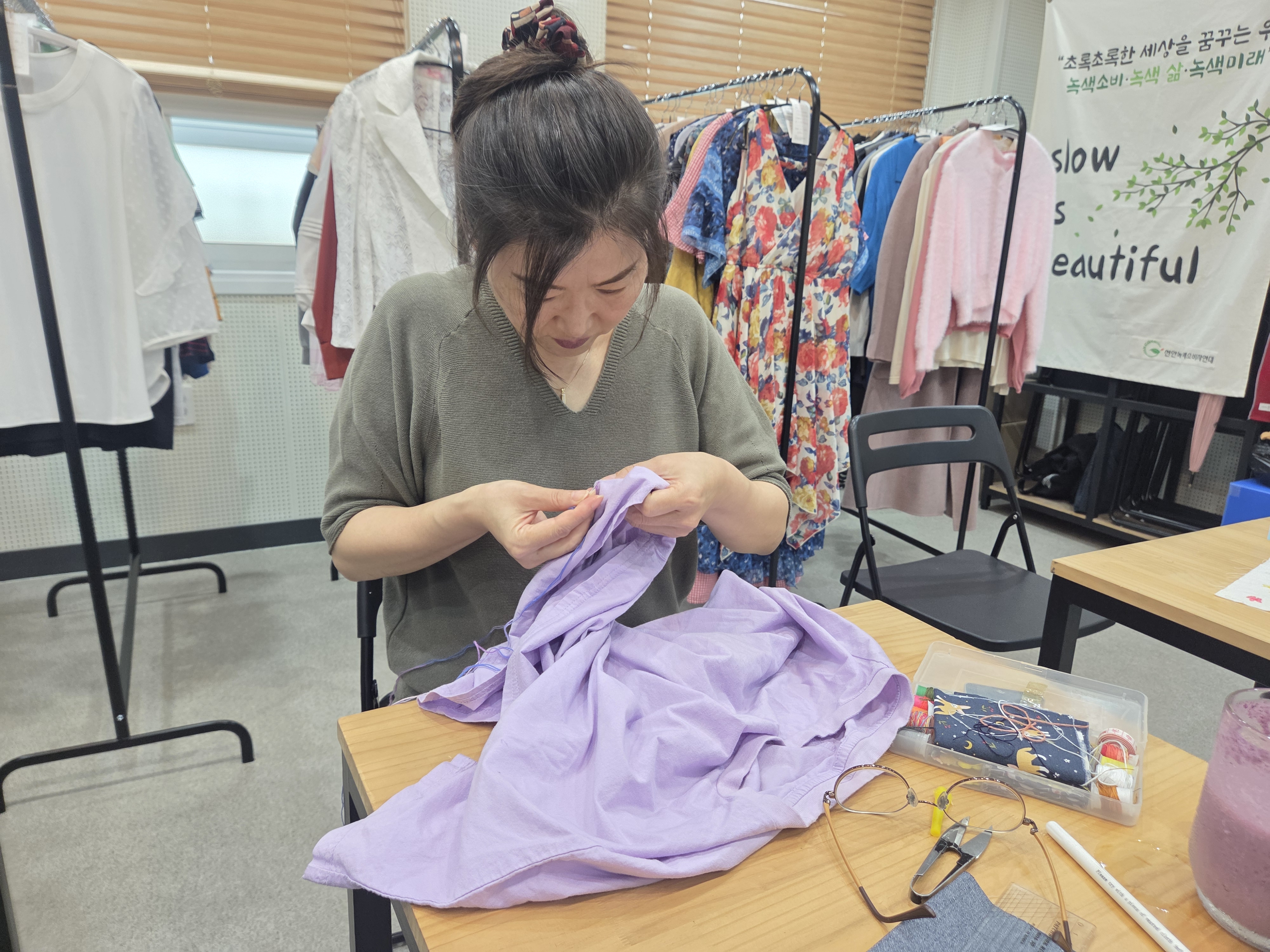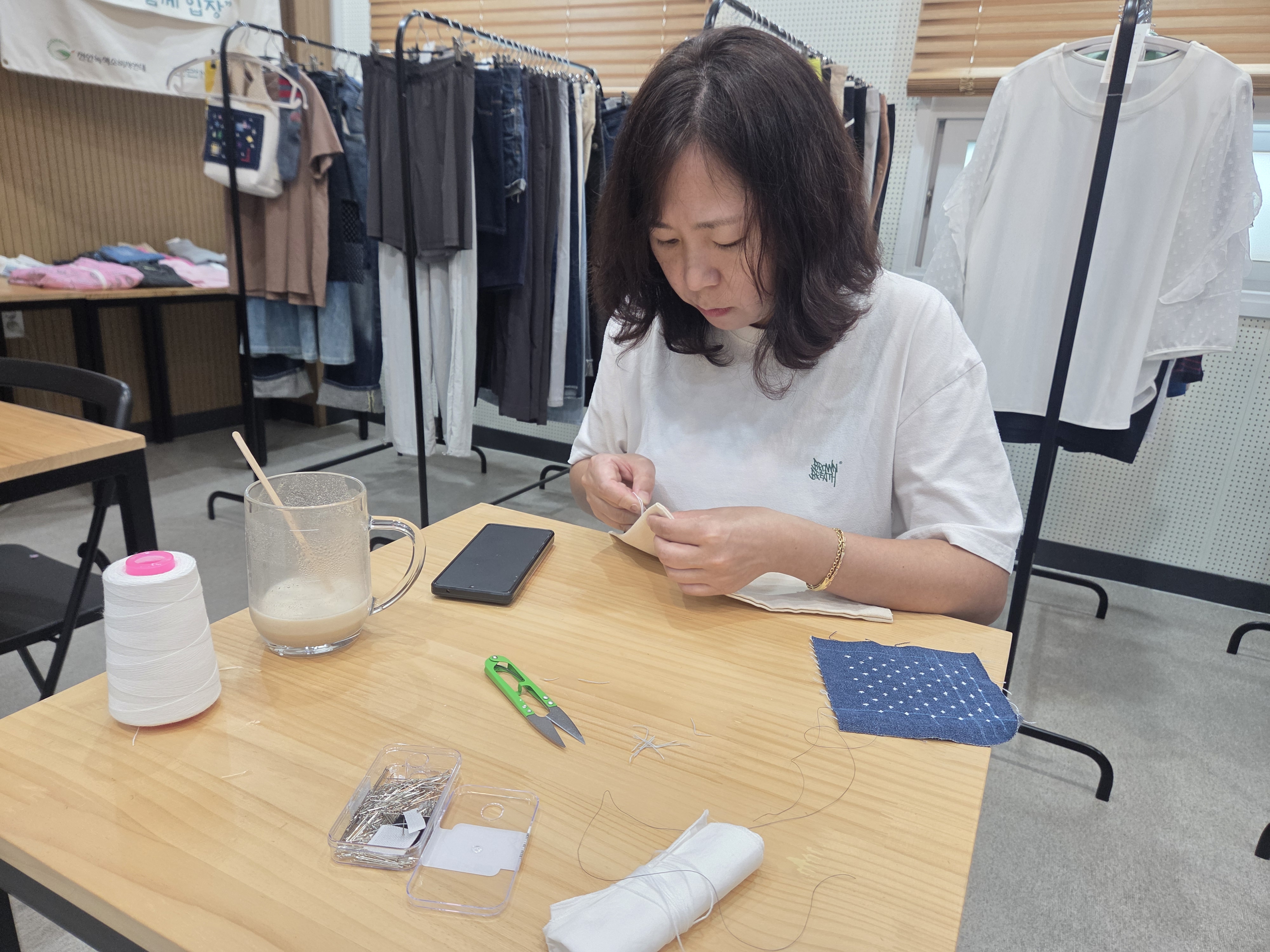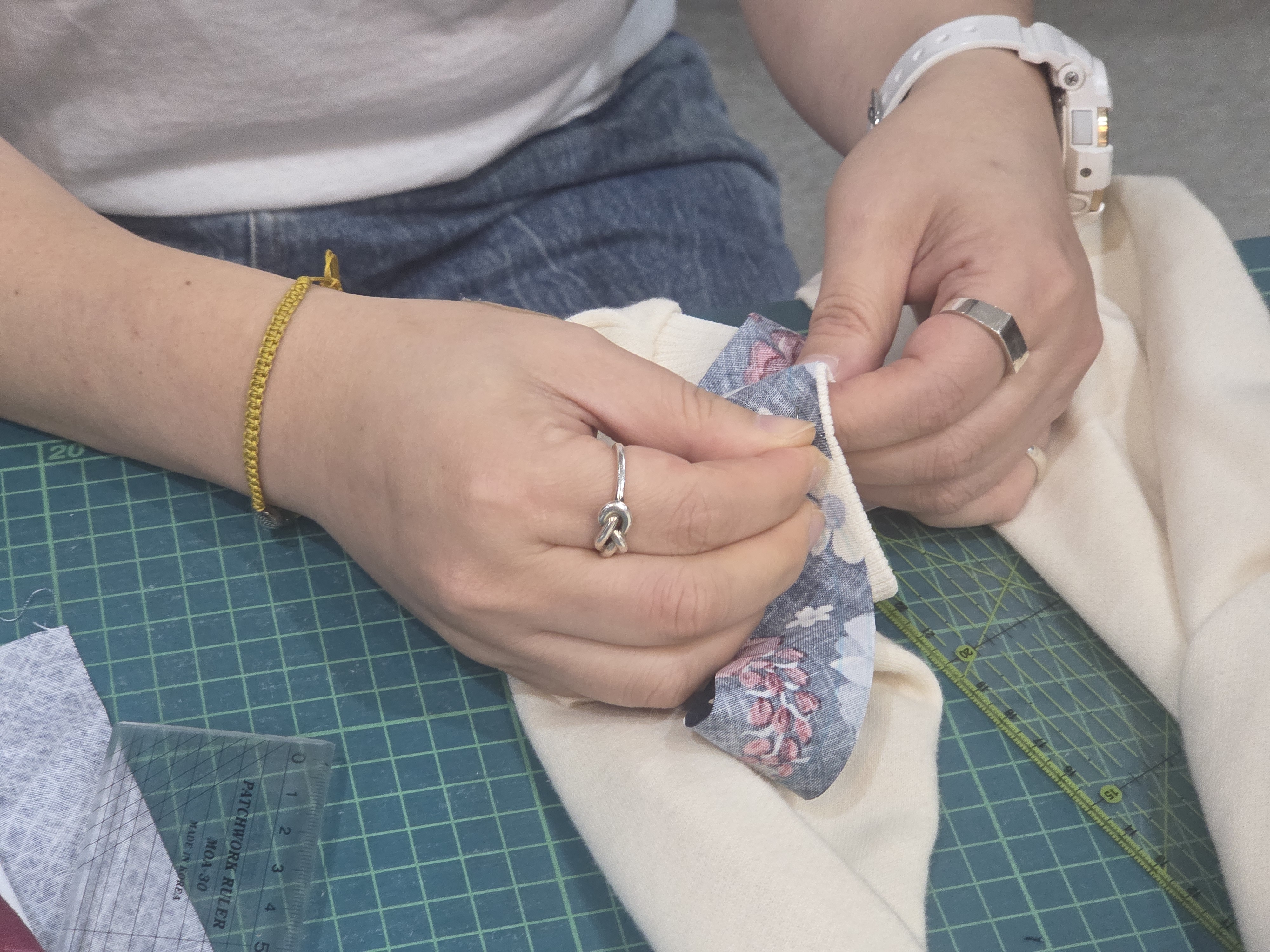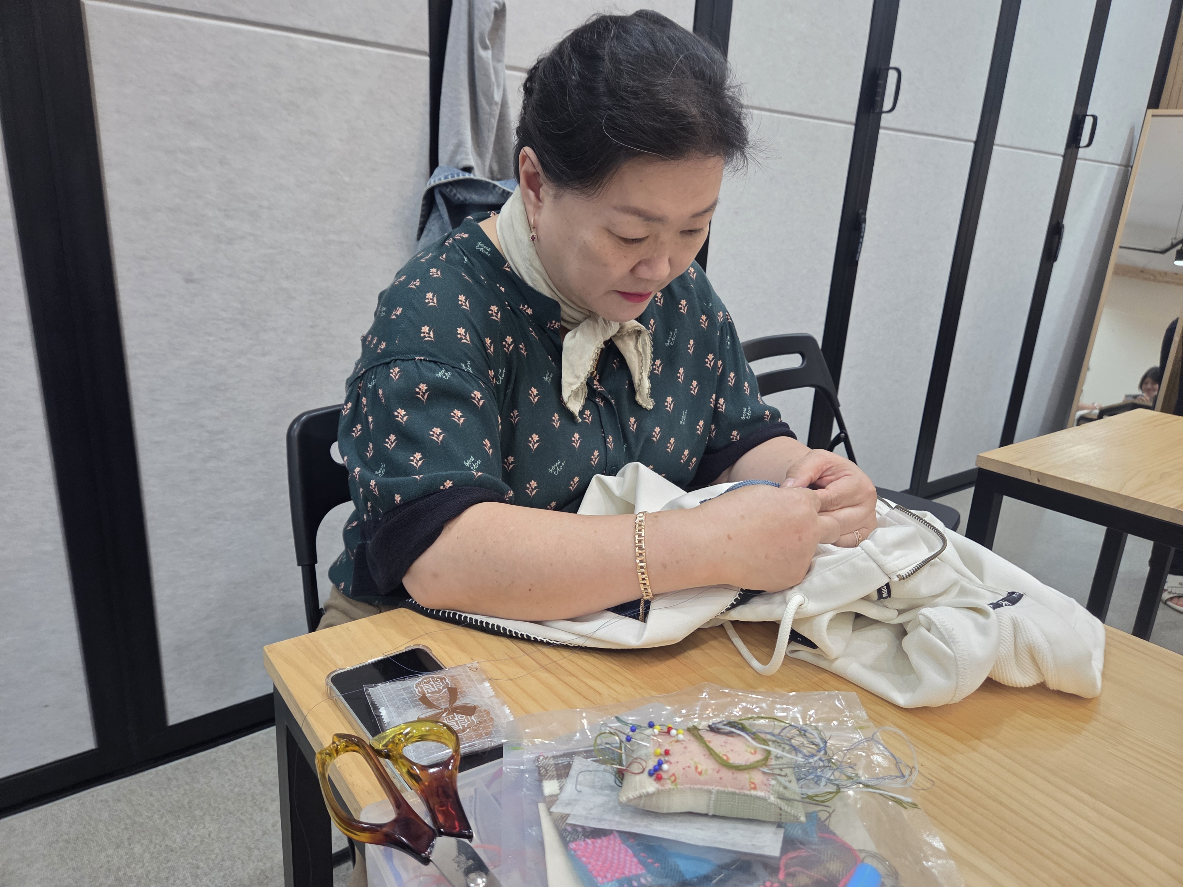 공예수선교실 제6강 '소매수선', 오늘은 조각 원단으로 낡은 소매를 수선하는 것과 청바지 등 바지단 줄이기를 진행하였습니다.
