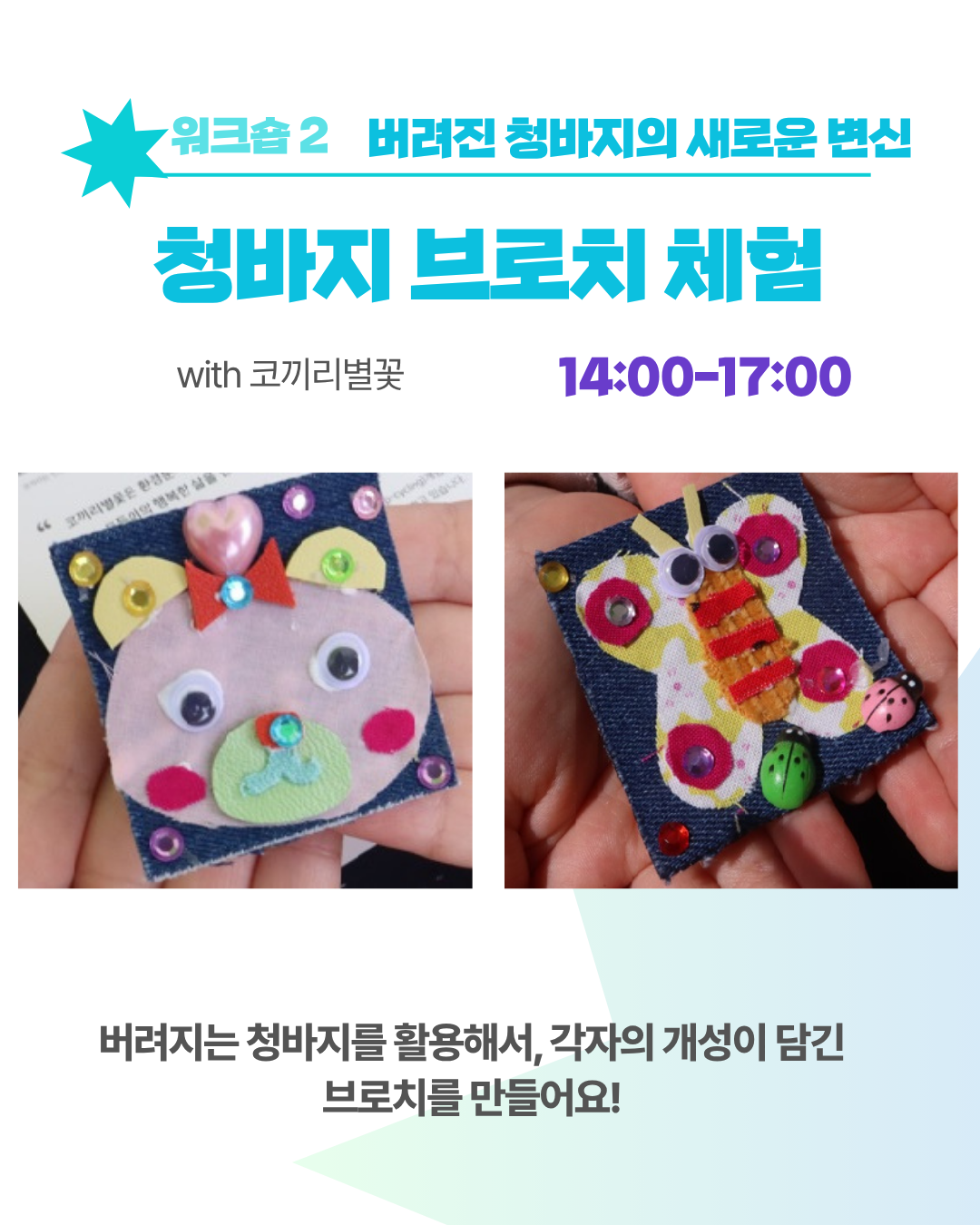 옷 교환 파티, 아플리케 체험, 다닝스티치 체험, 청바지 브로찌 만들기 체험, 천연보습립밥 만들기, 설거지바 만들기, 체험 등 다양한 체험거리들이 함께 합니다.