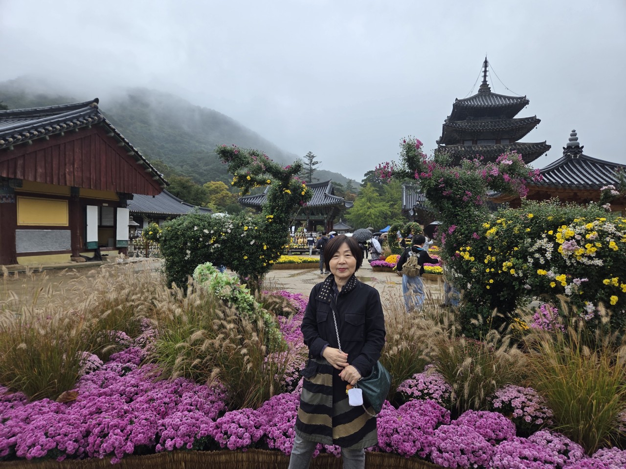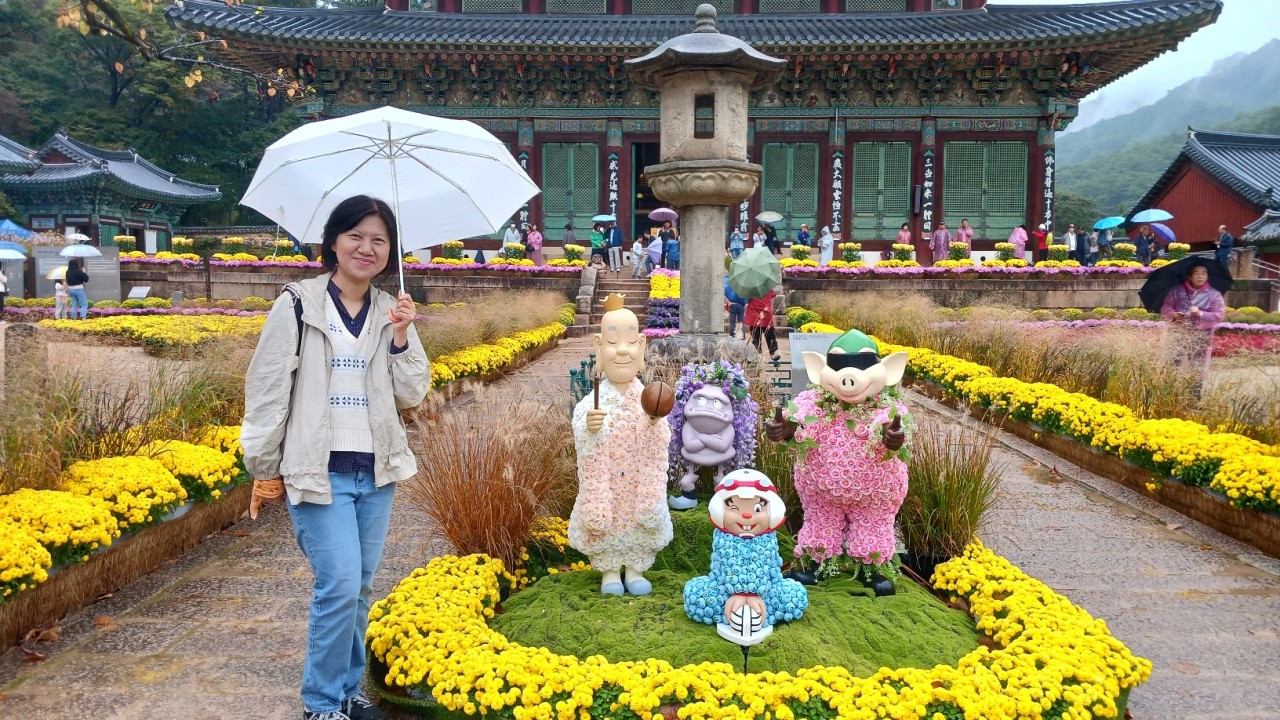 법주사는 국화꽃 축제가 열려서인지 사람들이 인산인해를 이루었지만 다양하게 장식한 국화꽃 사이사이에서 예쁘게 포즈도 한컷.