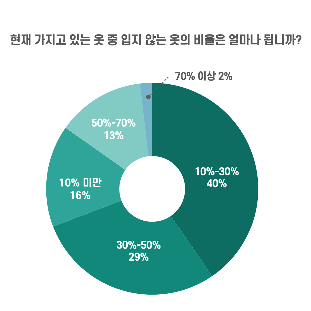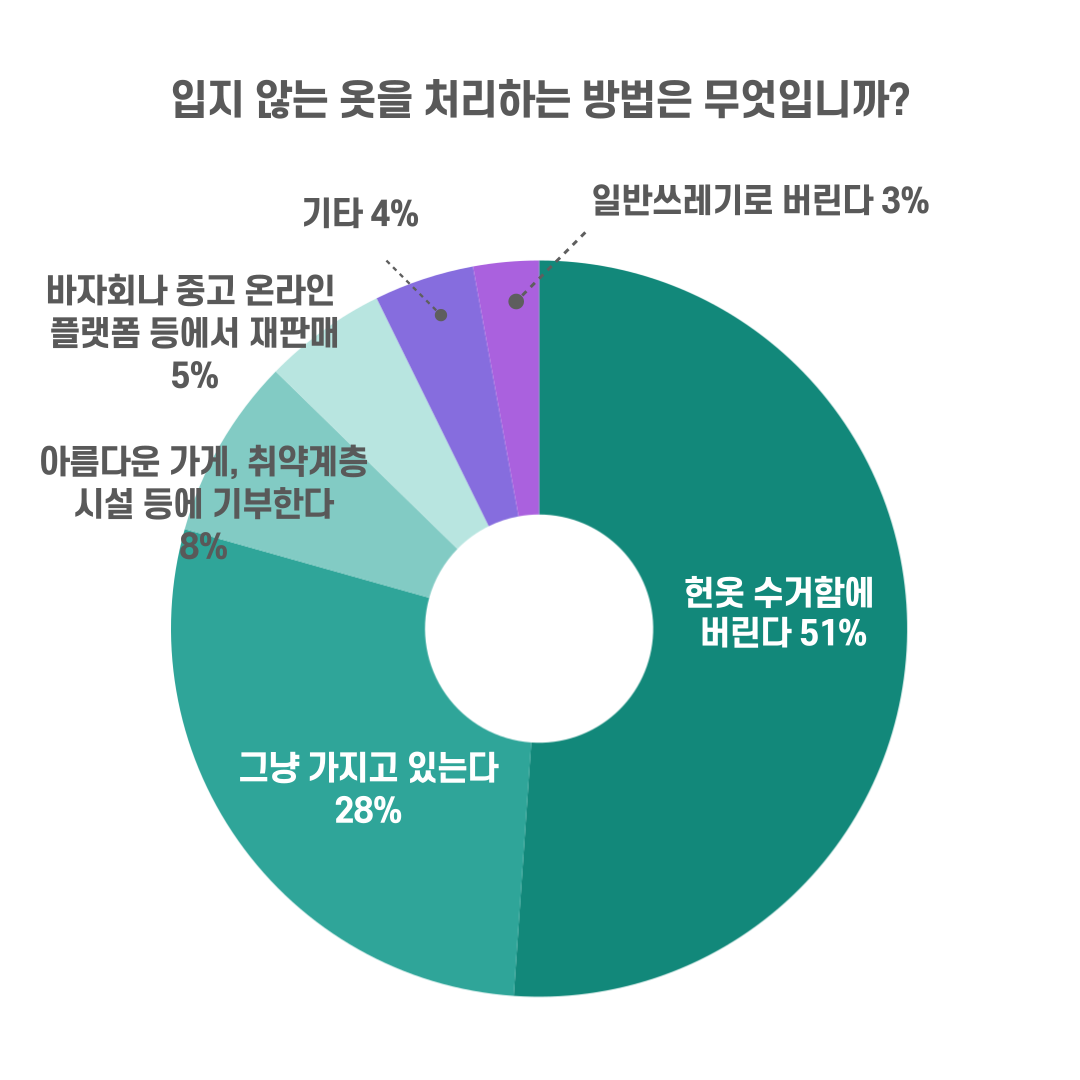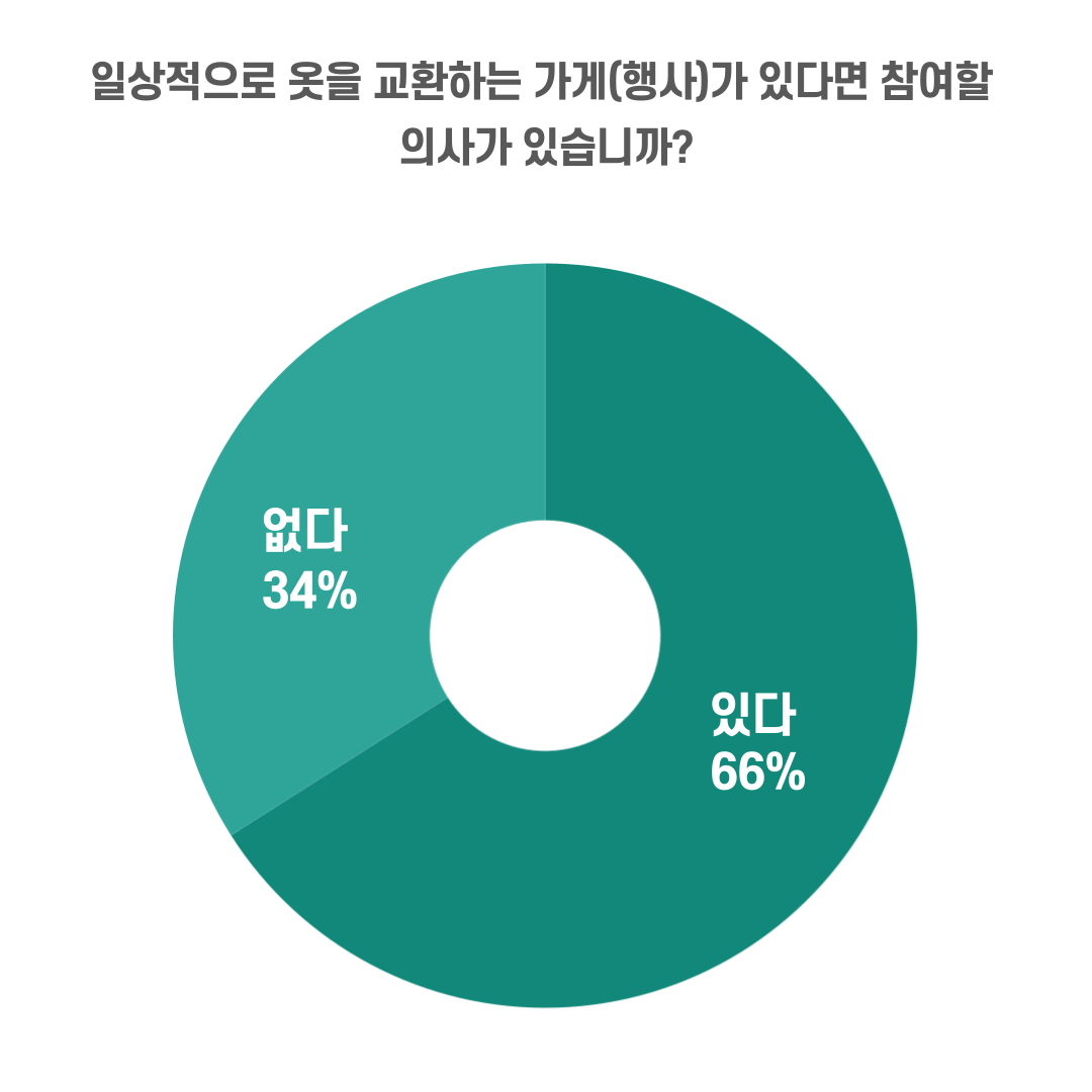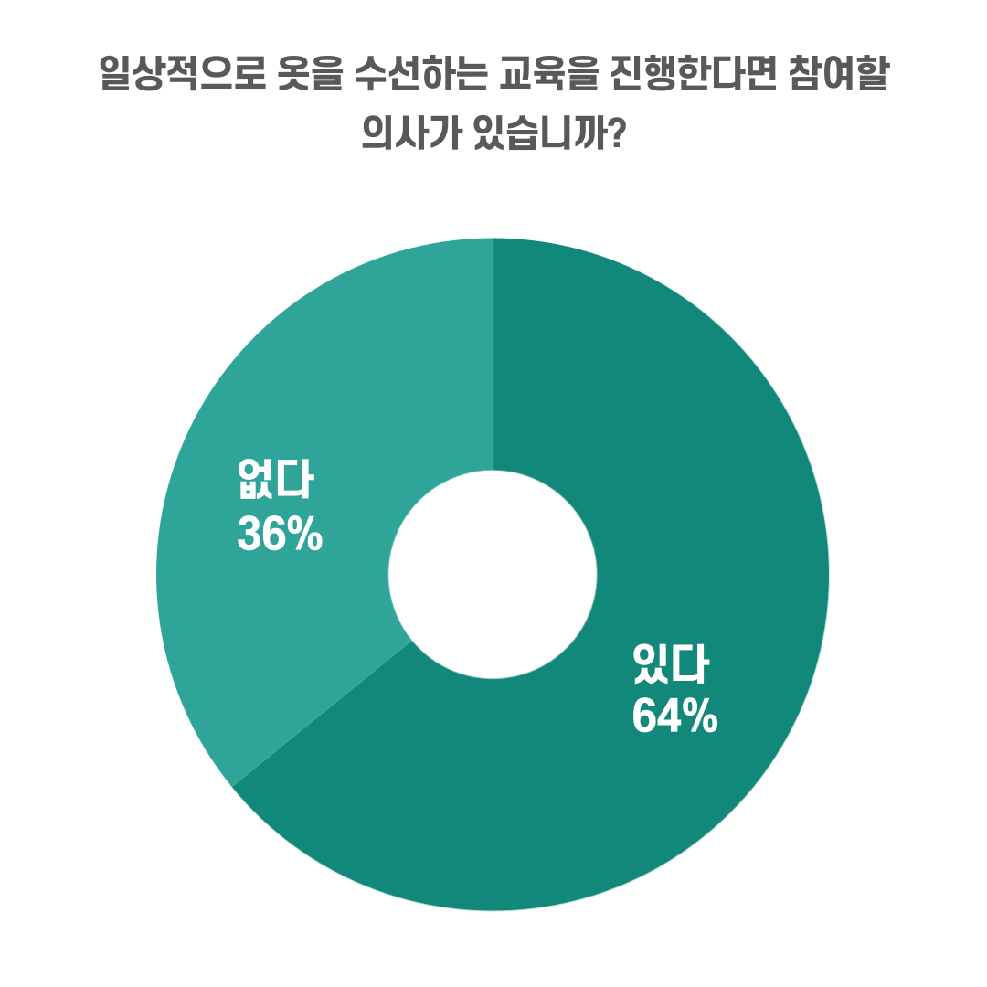설문 결과 입지 않는 옷을 처리하는 방법에 대해서 응답자 과반은 헌옷 수거함을 이용하고 있었고 입지 않아도 계속 소유한다는 응답도 28%로 나타났습니다. 반면 기부나 재판매 등으로 순환한다는 응답은 13%에 그쳤습니다. [일상적으로 옷을 교환하는 가게(행사)가 있다면 참여할 의사가 있다]는 답변이 66%로 나온 것과 대비됩니다. 의류 수선 교육 욕구도 높게 나타난 만큼 자원순환에 관심 있는 지역 단체와 연대하여 중고 의류를 교류하고 수선하는 의류 순환 플랫폼을 구축할 예정입니다.