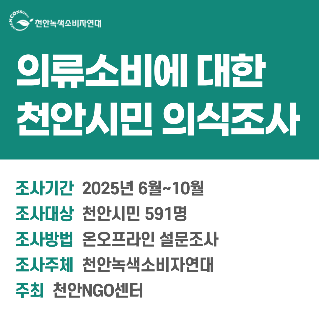 또한 천안시민들의 의류 소비에 대한 의식을 알아보고자 6월부터 10월까지 591명의 천안시민을 대상으로 의류소비 성향에 대한 설문조사를 진행하였습니다.