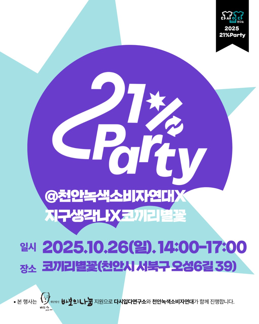 천안녹색소비자연대는 10월 26일(일) 입지 않는 옷을 교환해서 입는 21%파티를 진행합니다. 많은 관심과 참여 부탁드립니다.