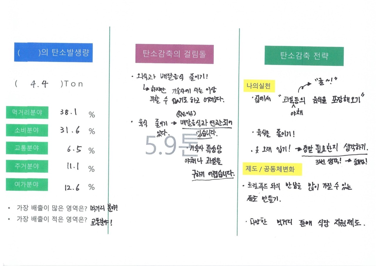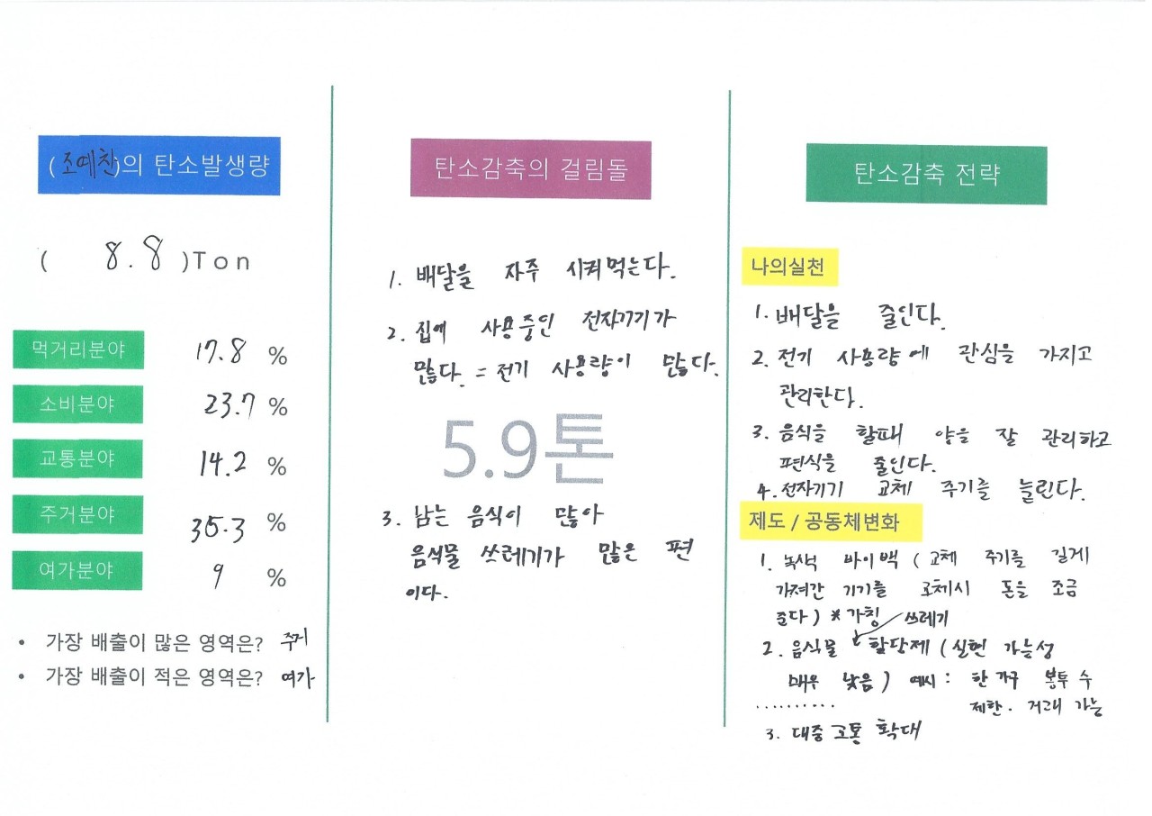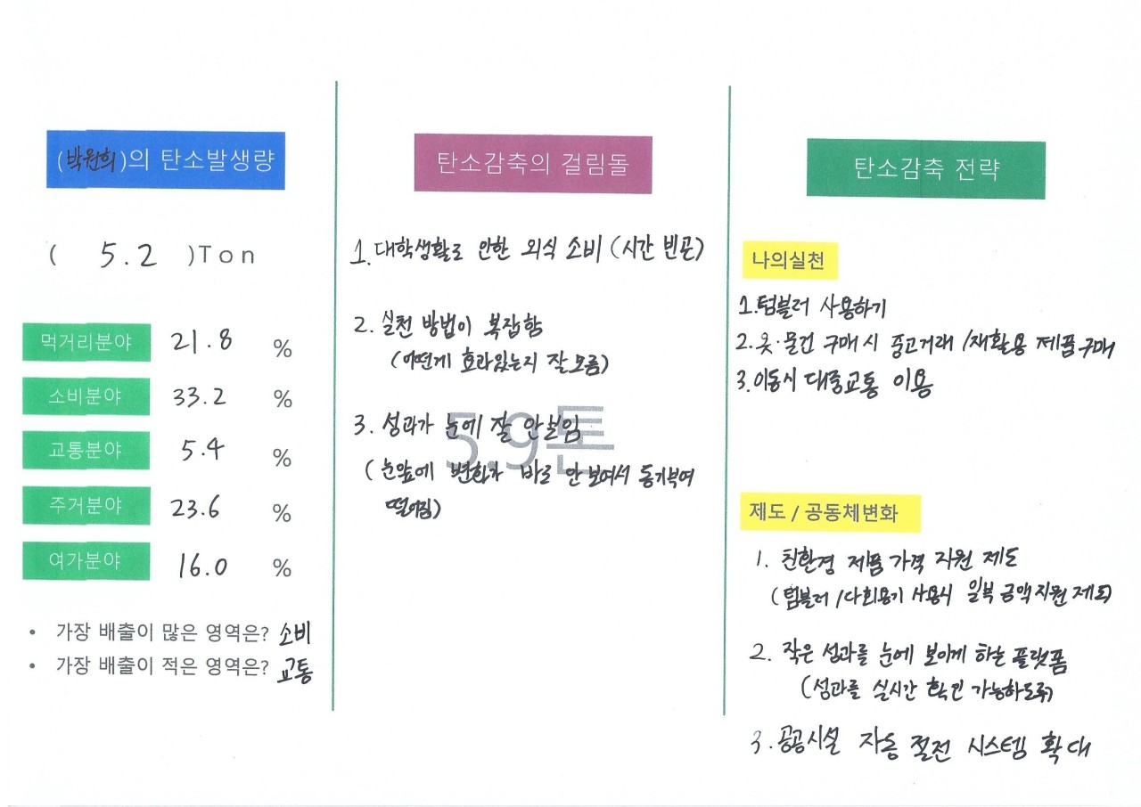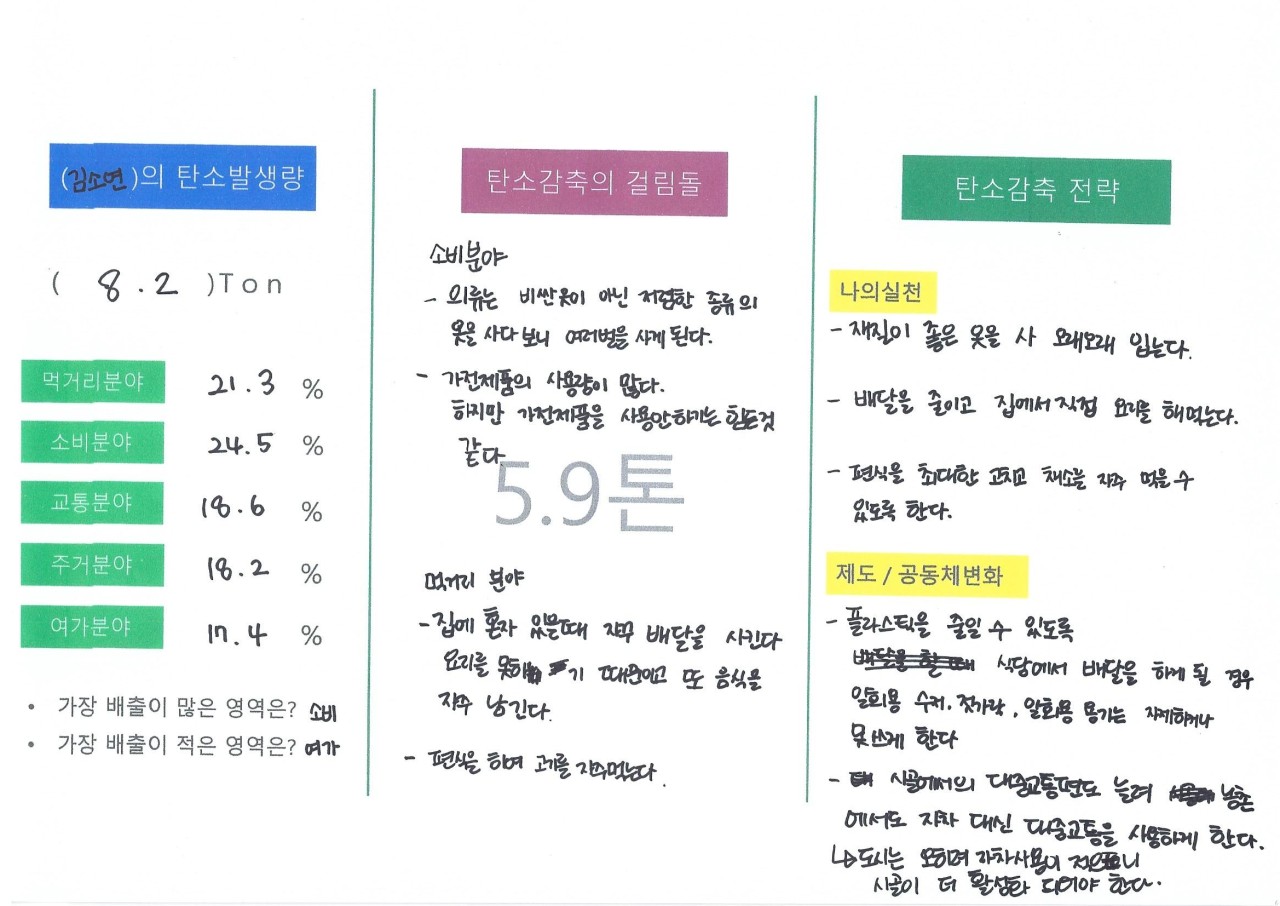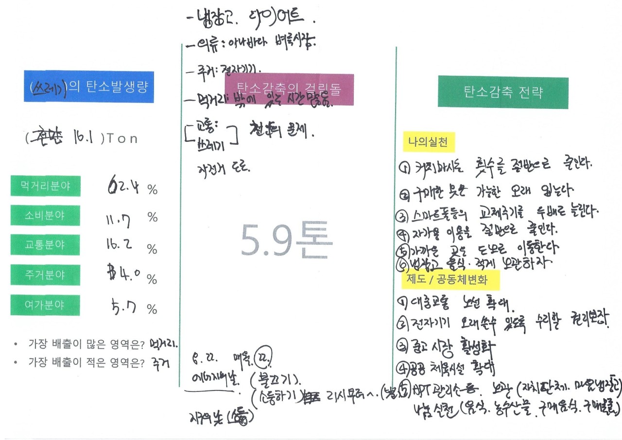 대학생들이어서 그런지 먹거리와 소비 분야에서 탄소배출량이 높게 나왔습니다.