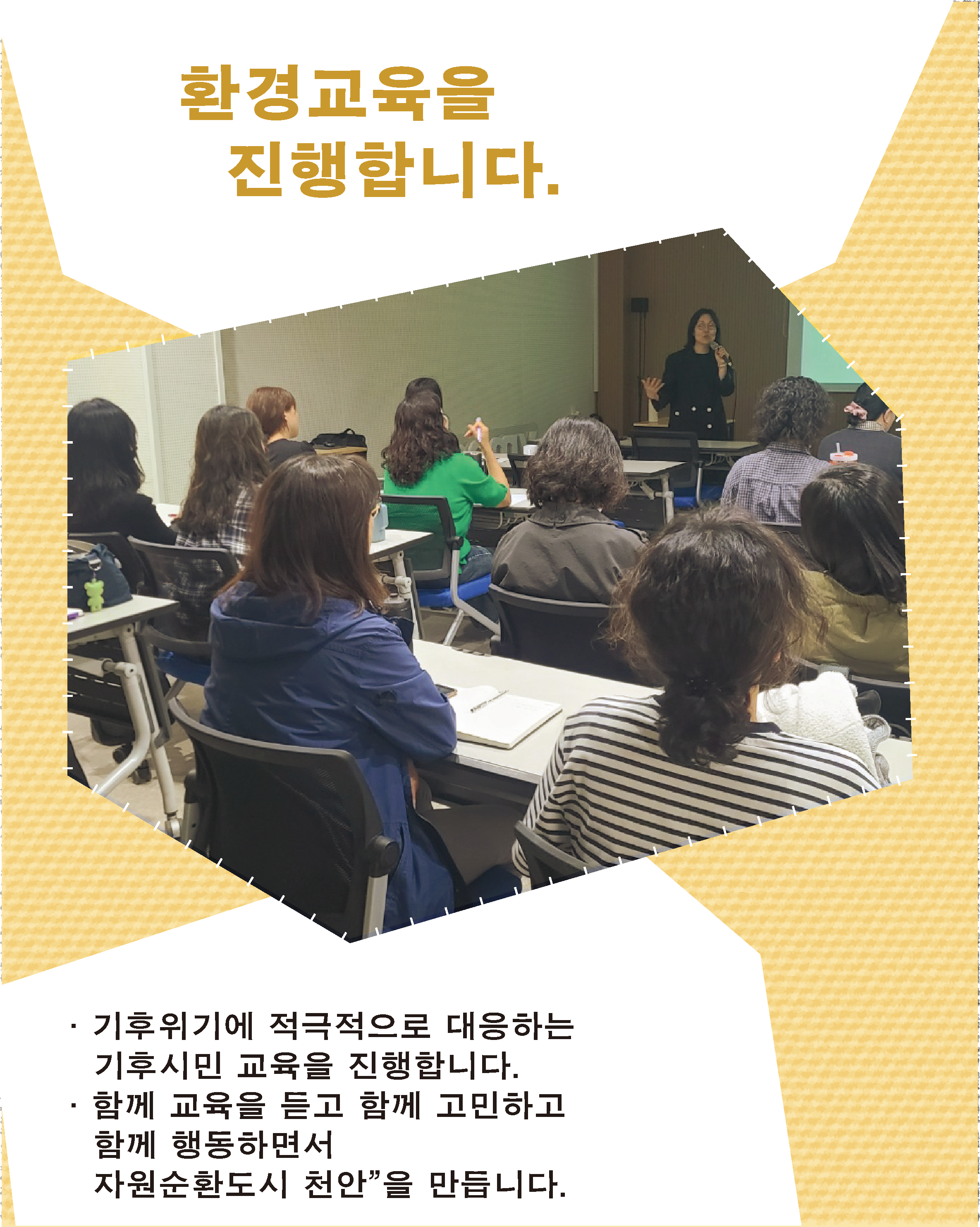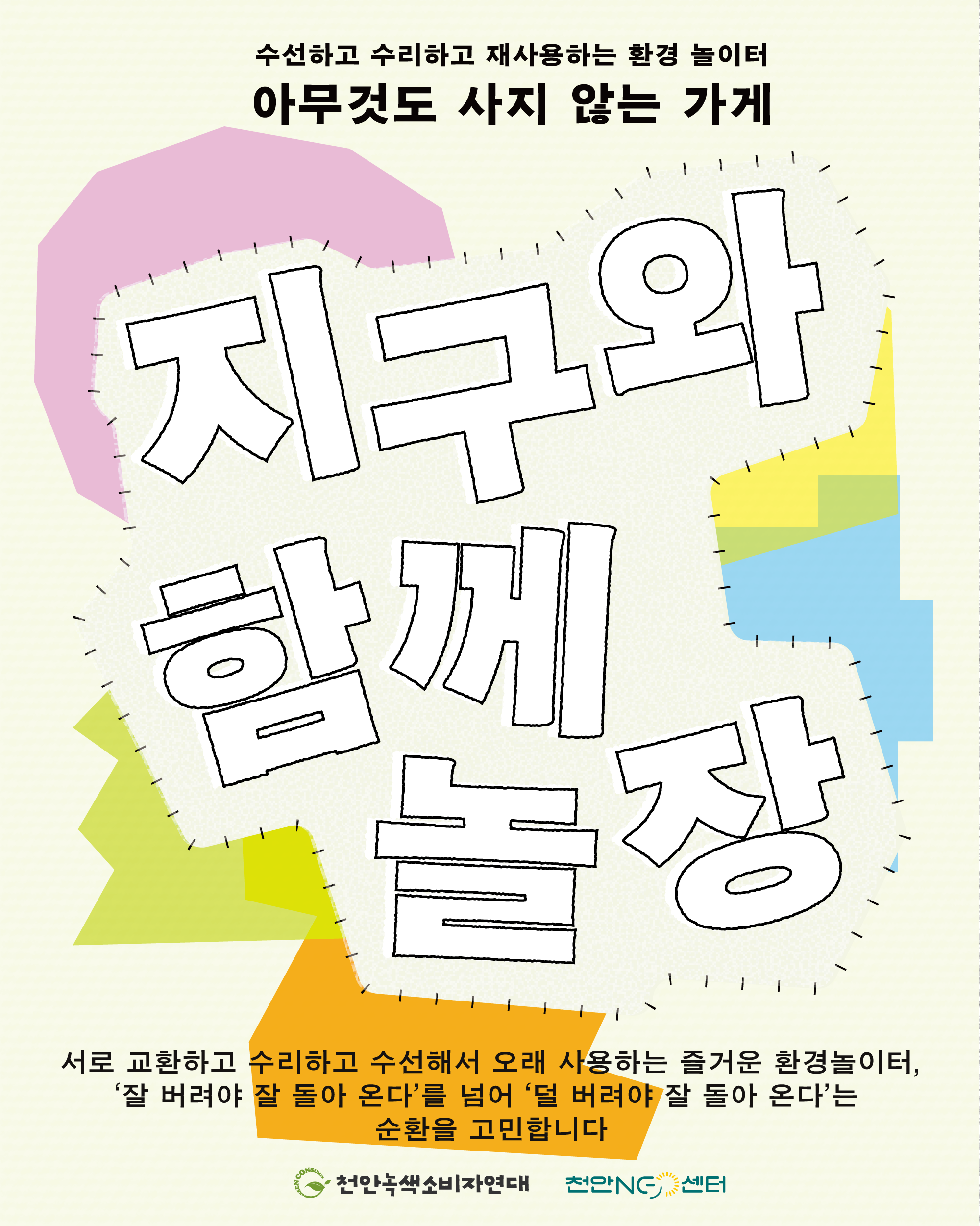 2025년 천안녹색소비자연대는 교환하고 수선하고 수리하는 자원순환 플랫폼 "지구와함께놀장"을 운영하였습니다.