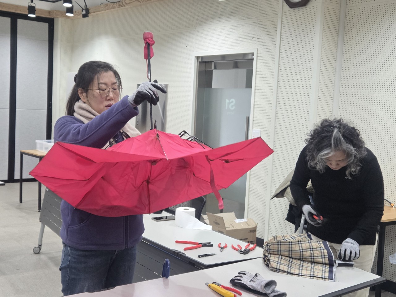 모아준 우산 중 사용 가능한 우산도 골라내고 수리 가능한 우산도 모아두고 수리가 불가능한 우산은 부품으로 따로 해체하였습니다.