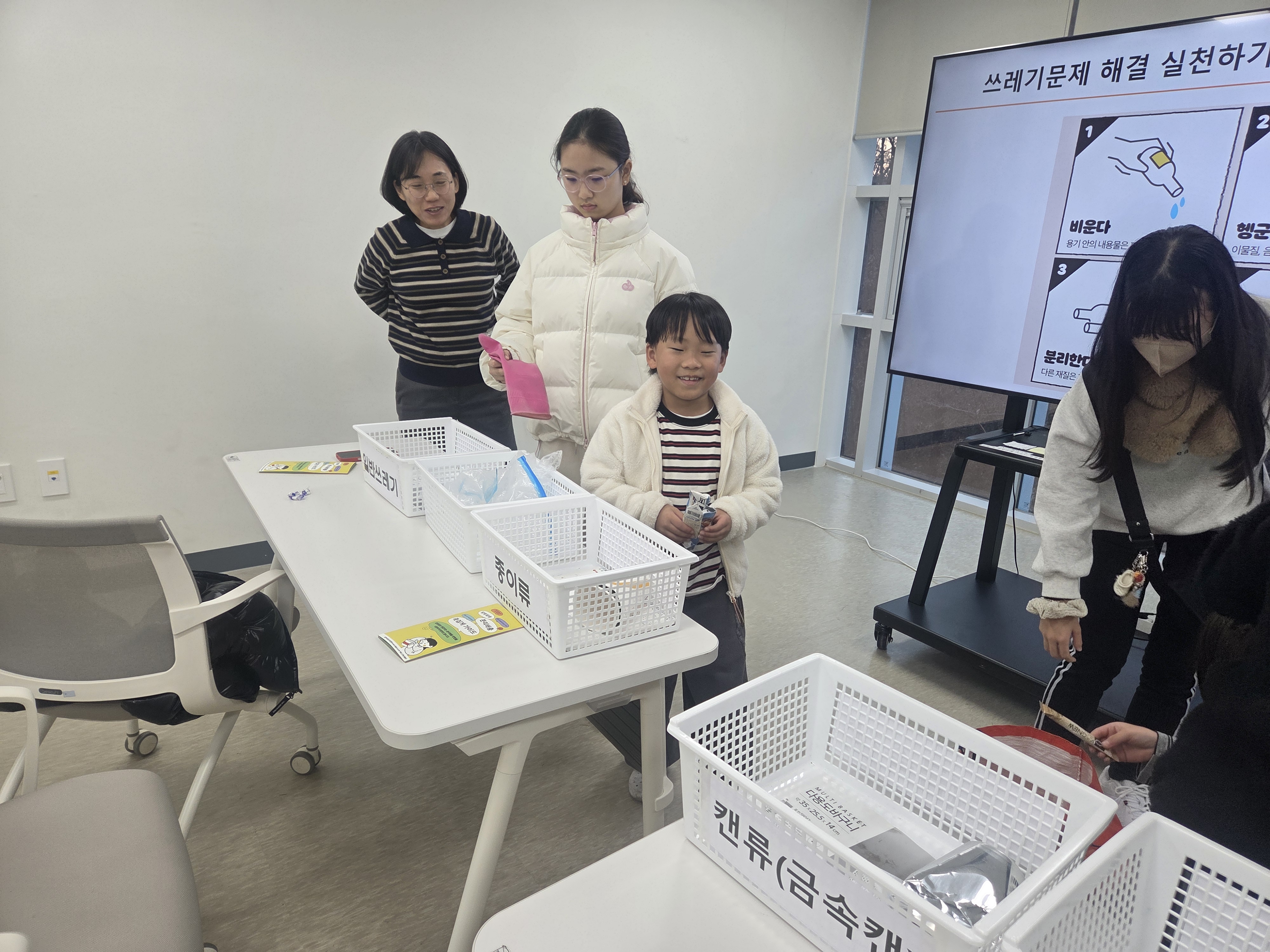 비행분섞 후 아이들과 직접 분리배출 체험도 하고 제대로 분리배출했는지 알아보았습니다.