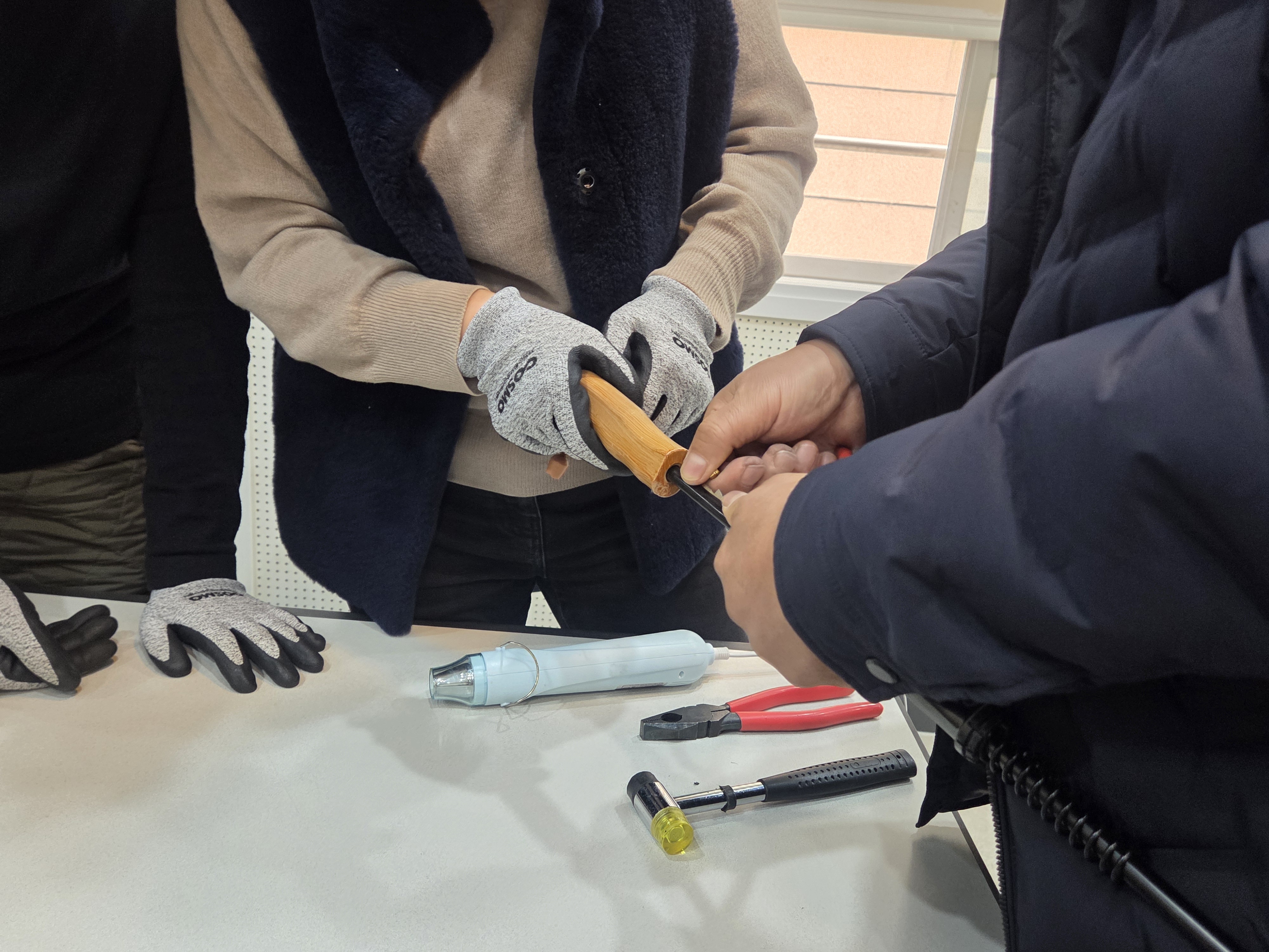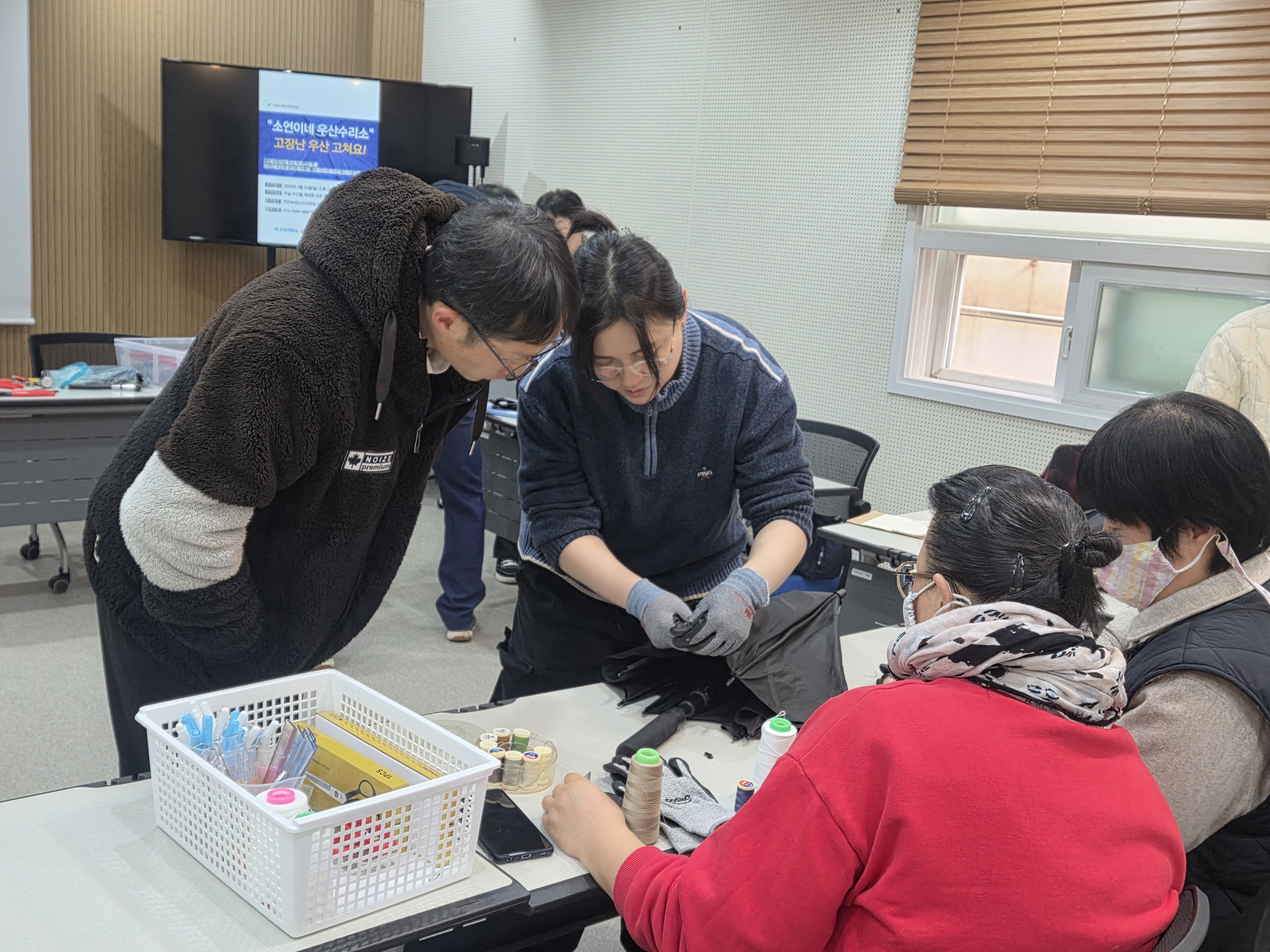 그동안 우산수리팀은 모여서 열심히 수거한 우산을 해체하는 작업을 했는데요 오늘은 수리상점 곰손 호우호우팀에서 우산수리 보수교육을 함께 진행해 주었습니다.