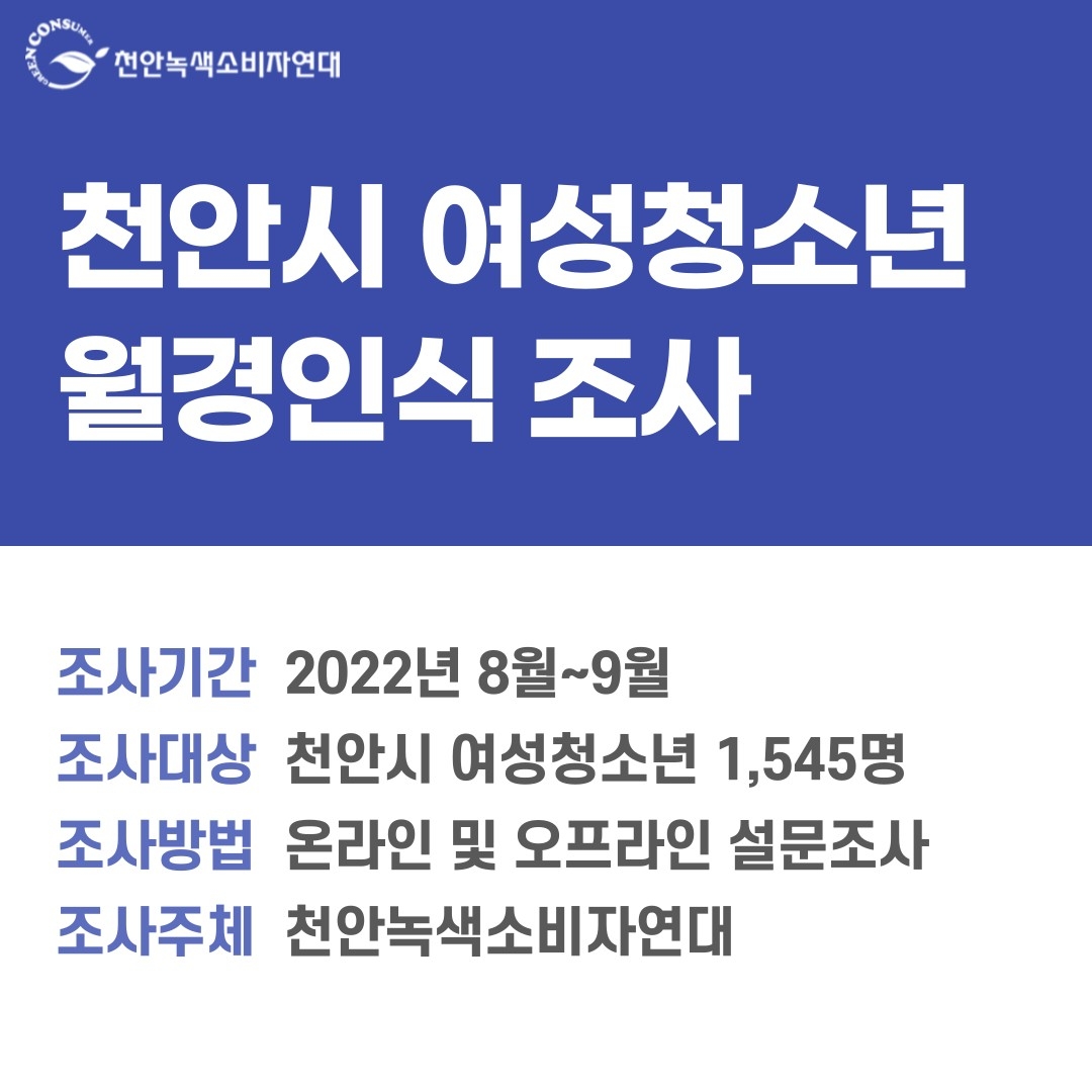 천안녹색소비자연대에서는 2022년 천안여성청소년 월경용품 보편지급을 위한 간담회(2022년 11월에 천안시 여성청소년 월경용품 지원에 관한 조레가 제정됨)을 시작으로 계층별 월경에 대한 인터뷰, 공공생리대 실험, "내 몸이 증거다" 다큐 상영회, 천안시 여성청소년 월경인식조사, 월경교육, 월경용품 전시회 등을 지속적으로 전개해 오고 있습니다.