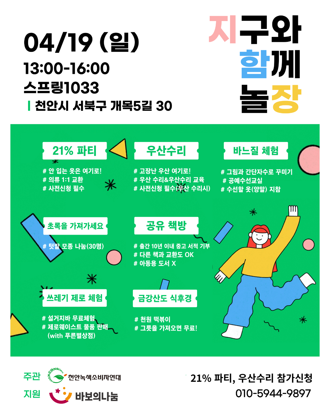 중고 의류 교환 프로그램인 21% 파티, 고장난 우산 수리하기(수리 배우기)를 비롯해 다양한 체험마당이 열립니다. 많은 관심과 참여 주변에 홍보 부탁드립니다.