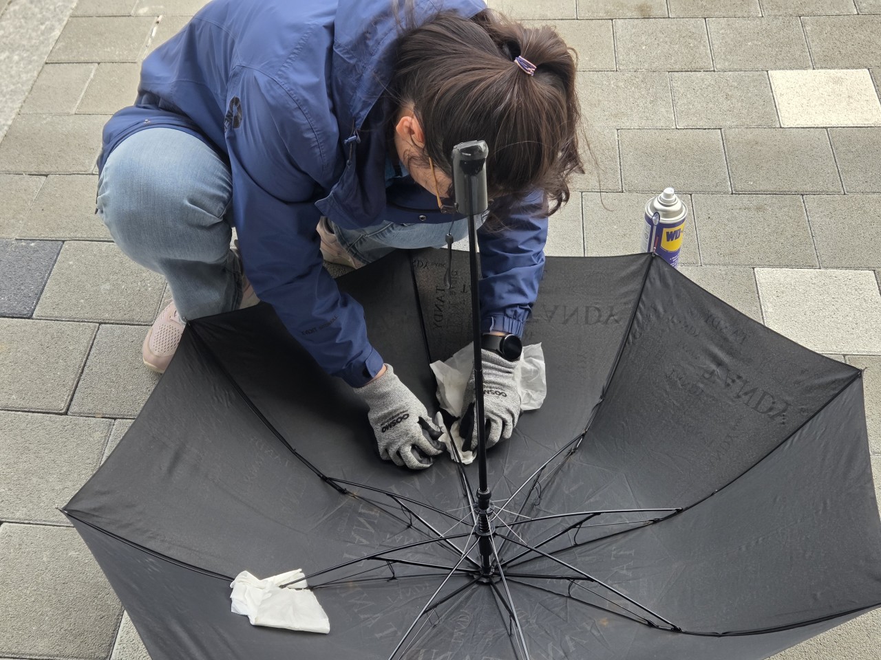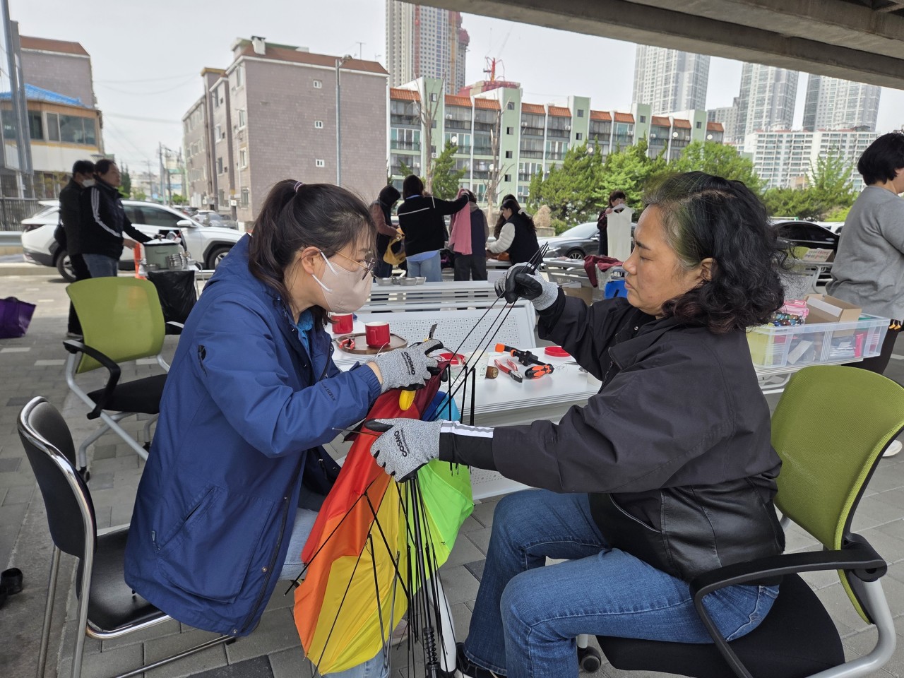 주민들이 가져온 고장난 우산을 요리조리 뜯어보고 머리를 맞대어 수리를 진행하였습니다.