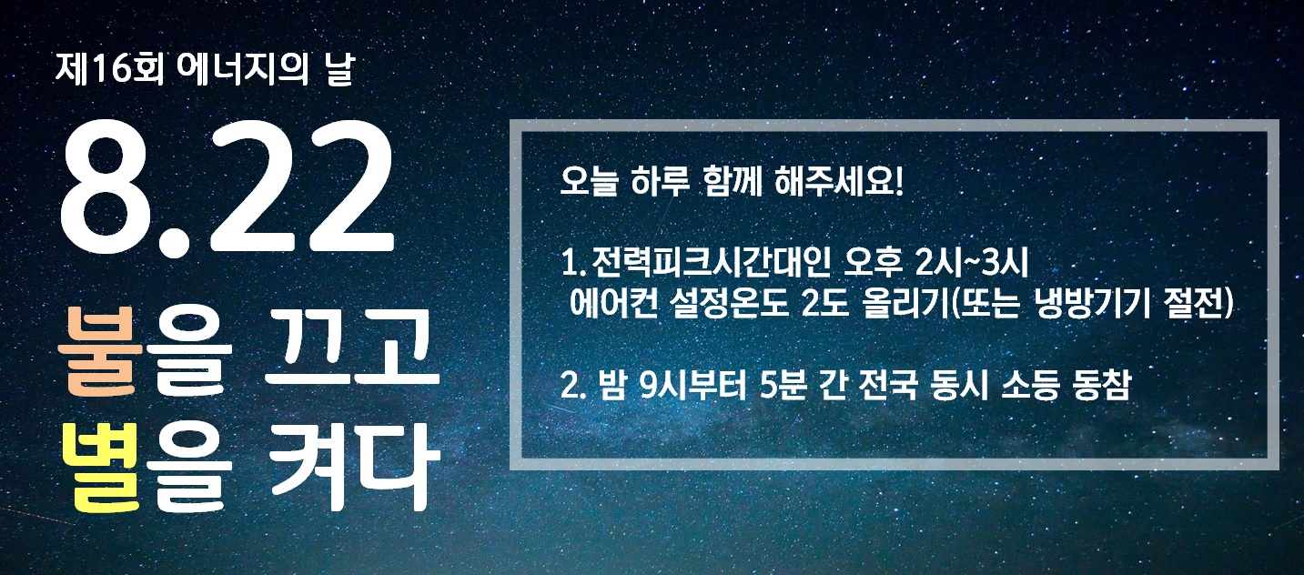전력피크시간대인 오후 2시~3시 한 시간 동안 냉방기기 사용 자제, 밤 9시부터 5분간 전국 동시 소등에 함께 해주시기 바랍니다. 소등 사진도 환영 환영!