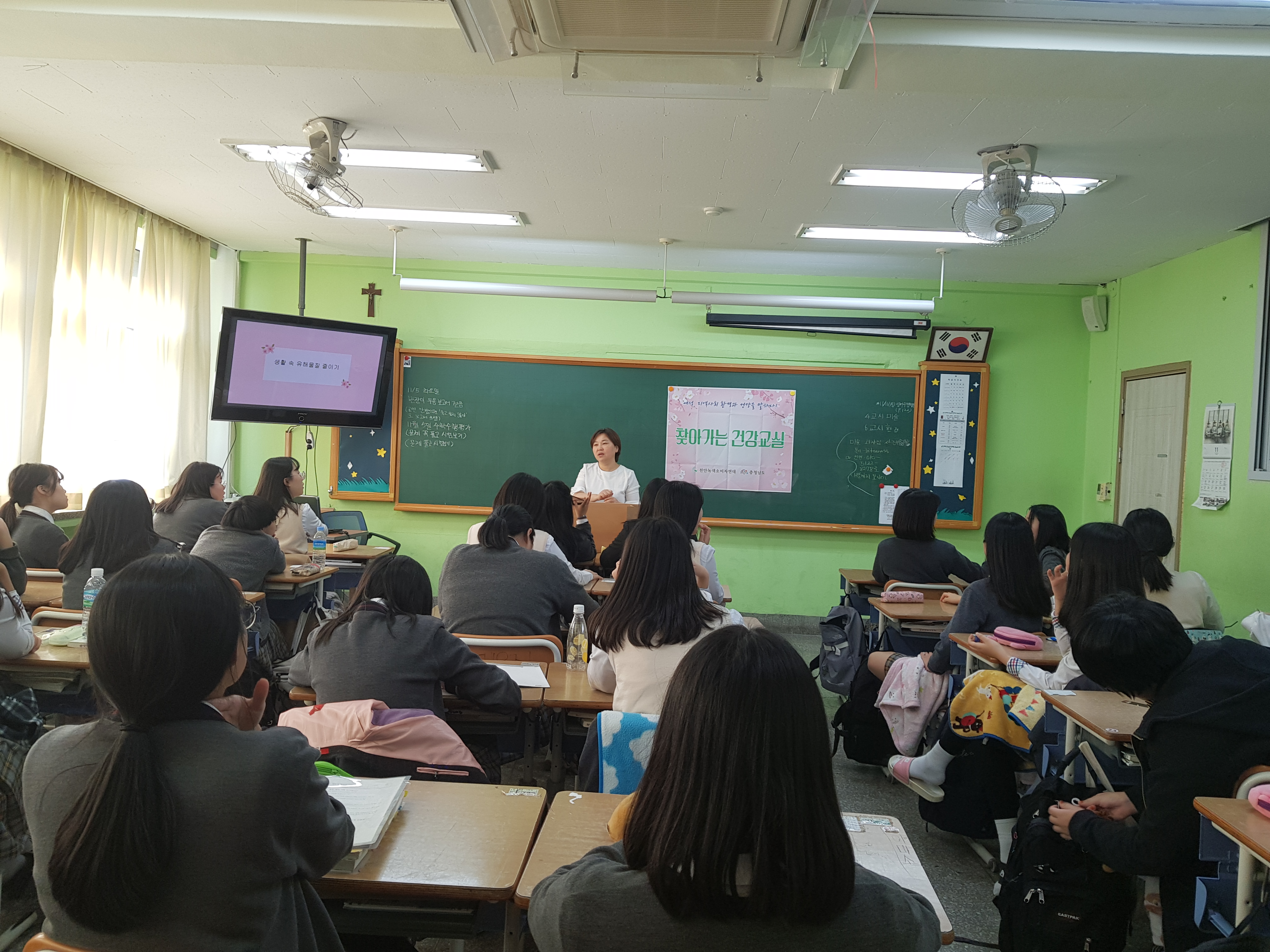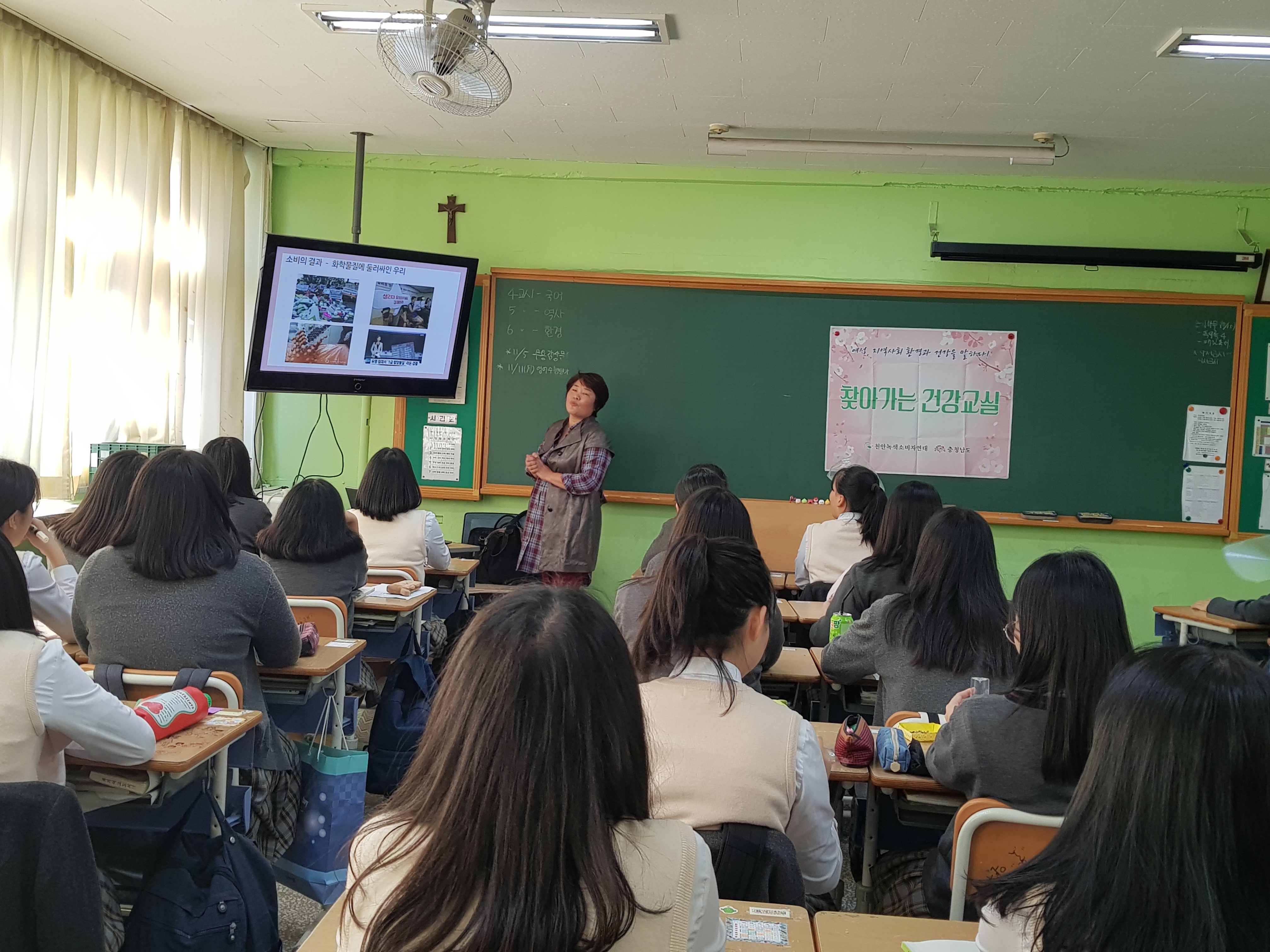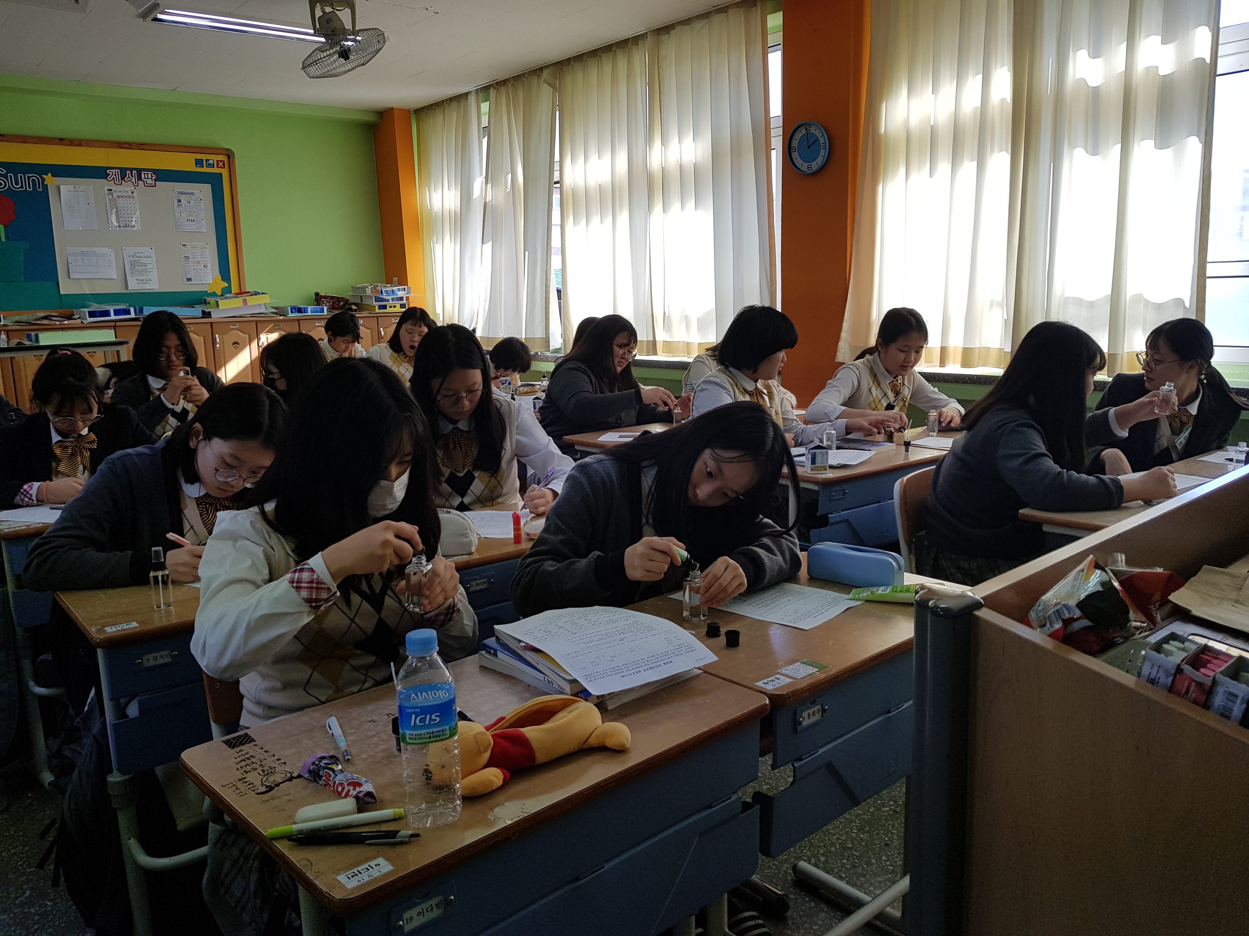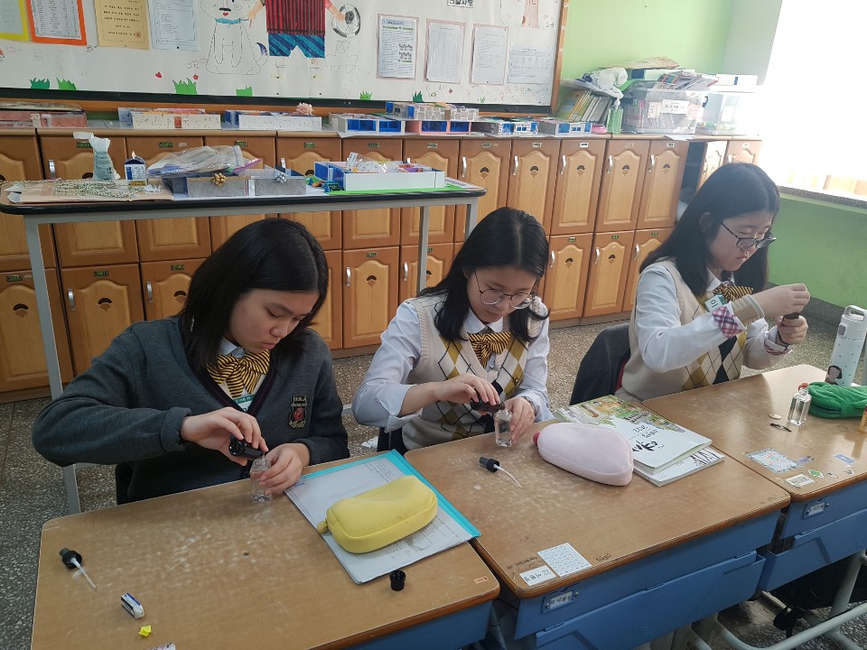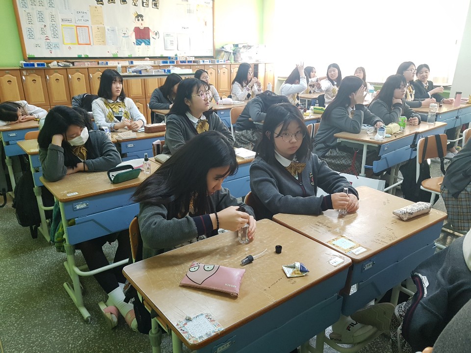 복자여자중학교 2학년 친구들과 함께 화장품 등 생활용품 속 유해화학물질 안전에 대해서 공부했습니다. 에센셜 오일을 이용한 섬유 탈취제도 만들어 보았습니다.
