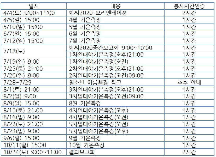 3. 활동내용 : 매월 정해진 시간에 본인의 측정지에서 온도계로 실외 기온을 측정하고 온라인 응답폼으로 측정사진과 측정 정보 전송