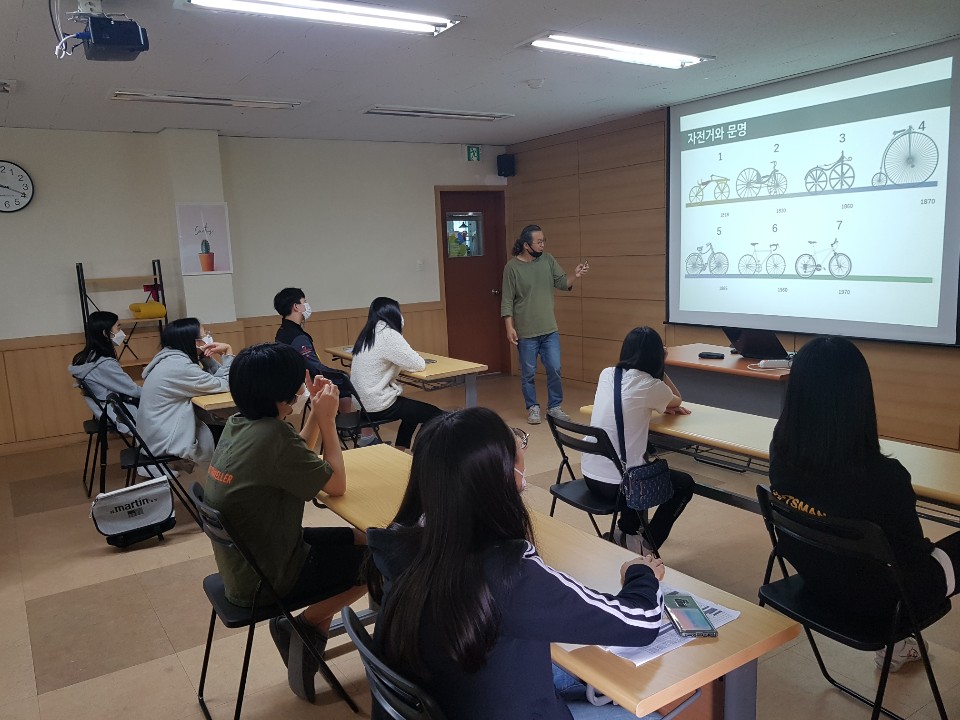지난주에 이어 청소년 교육 두 번째 시간 진행했습니다. 오늘은 천안시지속가능발전협의회 김우수 사무국장님과 함께 자전거를 중심으로 지속가능한 교통에 대해서 알아보았습니다. 자전거의 역사에서부터 시작해 천안의 생태교통, 나아가 베리어프리 운동까지 폭 넓게 짚어보았습니다. 자전거와 킥보등 등 청소년들의 삶과 밀접한 소재를 다루어서인지 집중도가 높았습니다. 우리가 매일 아무 생각 없이 걷는 길들이 목발을 짚거나 휠체어를 타고, 혹은 유아차를 밀며 지나가기에도 적합한지 곰곰이 생각해보기로 했습니다.