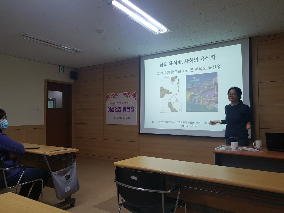 2020 여성건강학교 2강, <대한민국 치킨전> 정은정 작가님과 함께 했습니다. <대한민국 치킨전>은 대한민국의 대표적인 매식인 치킨을 중심으로 한국의 먹거리 문화와 산업을 해부한 책입니다. 음식 사회학을 다룬 대표적인 책 중 하나입니 다.