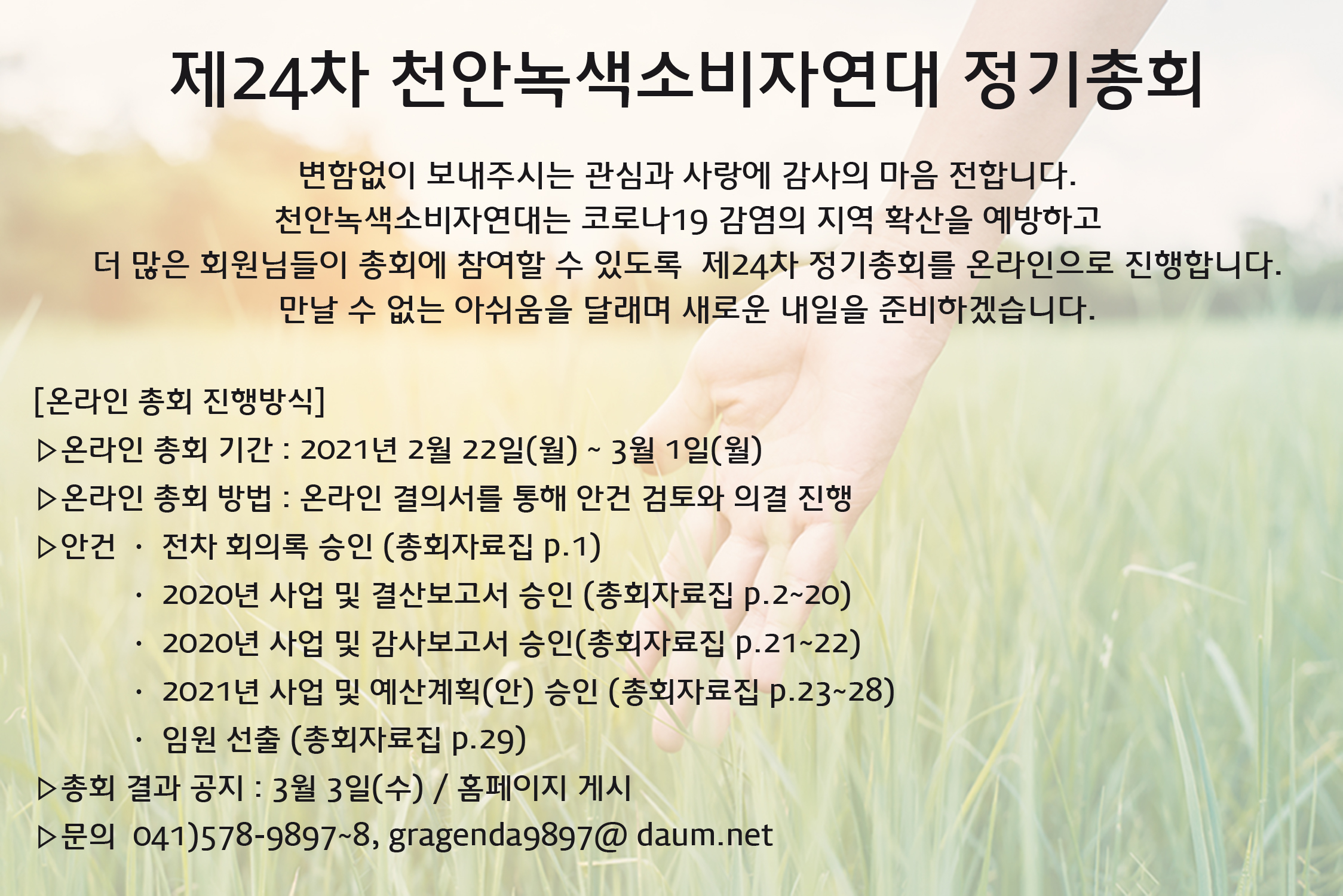 | 제24차 천안녹색소비자연대 정기총회 공고 (0) | 2021.02.05 |