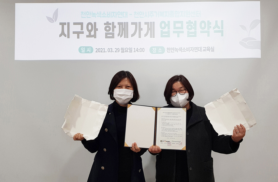 □ 천안녹색소비자연대(공동대표 김희자, 장민수, 최문환)와 천안시주거복지종합지원센터(센터장 김희정)는 3월 29일 <지구와함께가게> 업무협약을 체결했다.