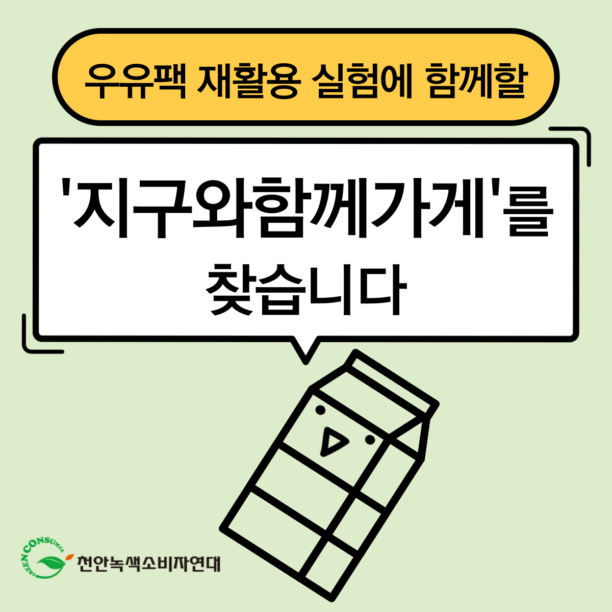 -우유팩 분리배출 실험에 도전할 천안의 카페와 빵집을 모집합니다. 관심 있는 매장의 자발적인 접수, 내 주변 매장 추천(제보) 모두 환영합니다.