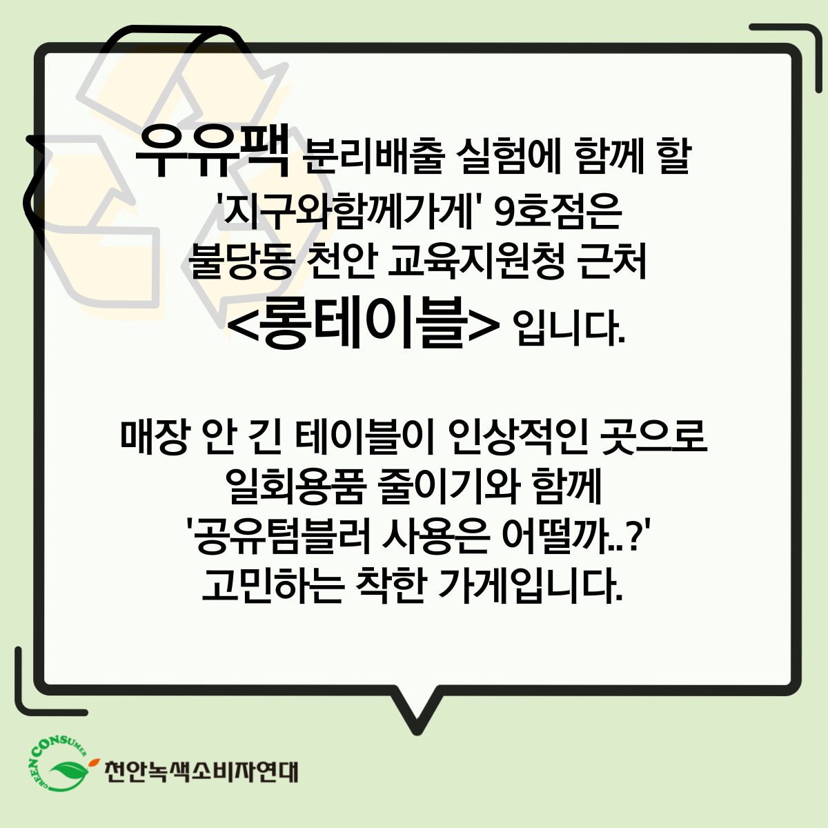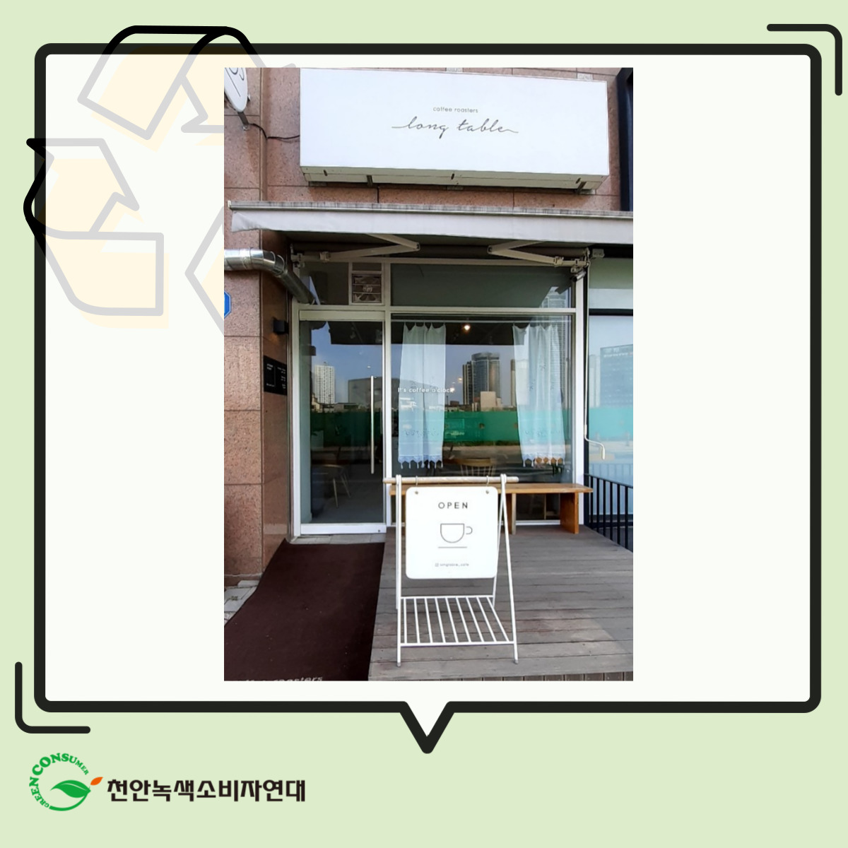 <지구와함께가게> 9호점은 불당동 <롱테이블>(인스타그램 계정 @longtable_cafe)입니다.직접 로스팅한 원두로 내린 커피가 맛있는 곳입니다. 아짐 8시 오픈이라 이른 커피를 찾는 분들에게 딱입니다.