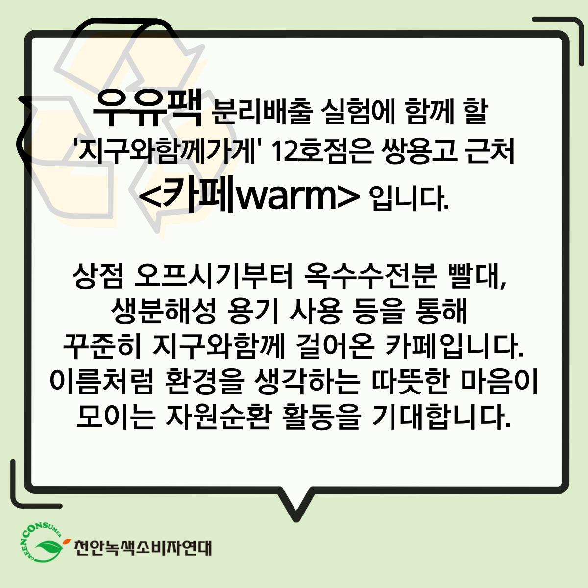 <지구와함께가게> 12호점은 쌍용동 <카페warm>입니다.