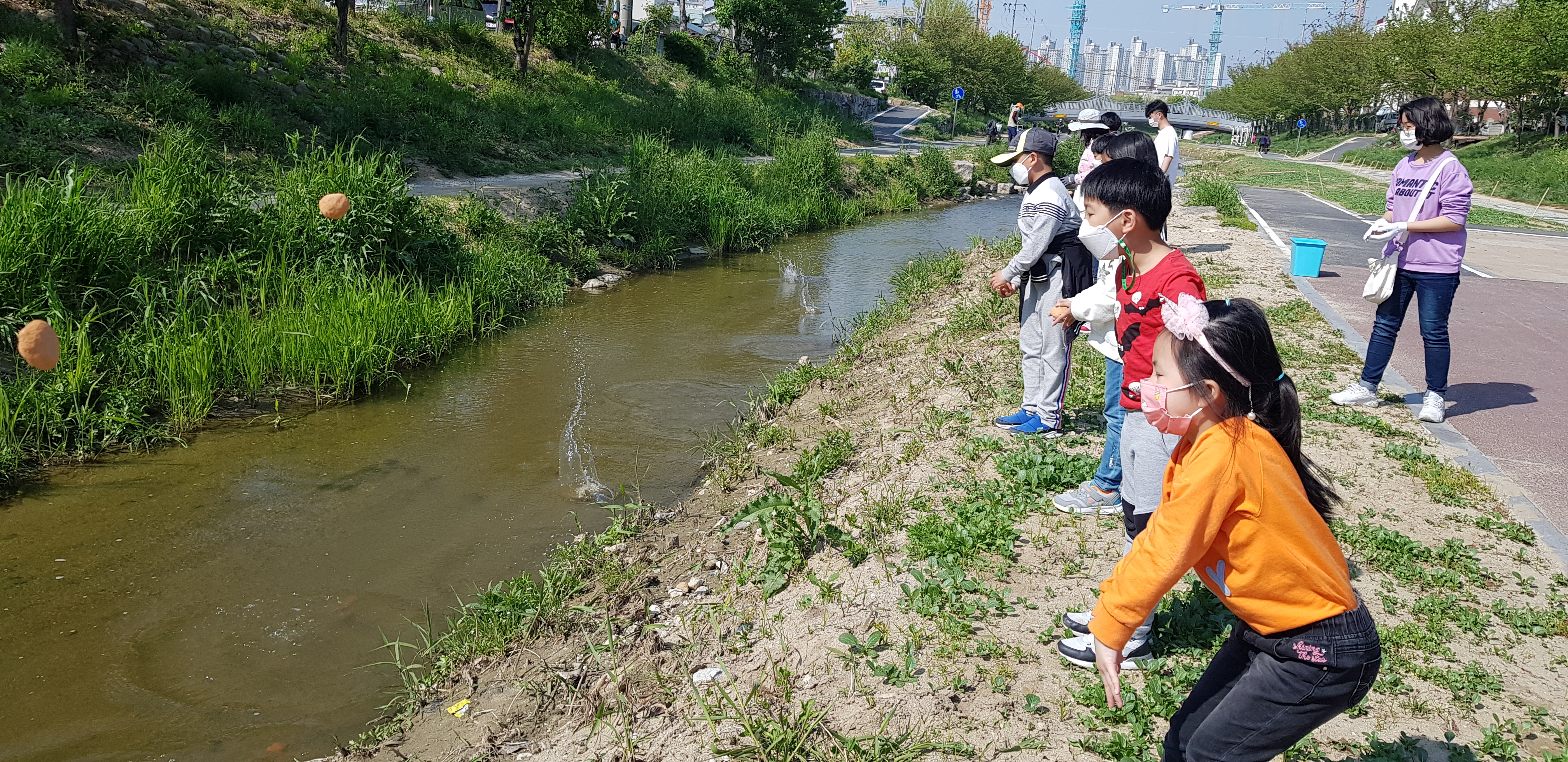 햇살가득파랑새 지역아동센터 친구들과 함께 원성천에 EM흙공을 넣어주었습니다. 지난 3월에 다같이 만들었던 흙공입니다. 하천 주변 정화 활동도 겸했습니다.