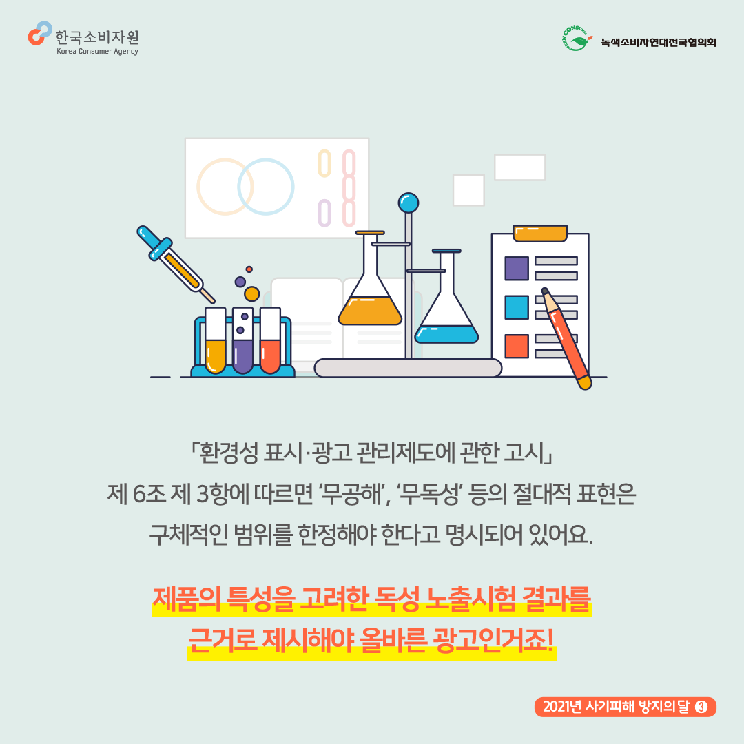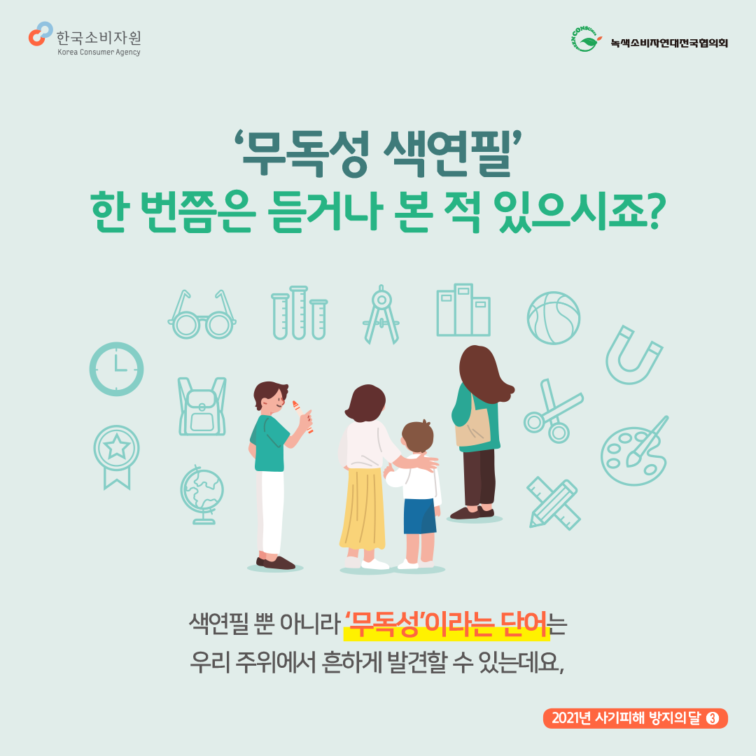 색연필 뿐 아니라 ‘무독성’이라는 단어는 우리 주위에서 흔하게 발견할 수 있는데요, [환경성 표시⋅광고 관리제도에 관한 고시] 제6조 제3항에 따르면 ‘무공해’, ‘무독성’ 등의 절대적 표현은 구체적인 범위를 한정해야 한다고 명시되어 있어요.