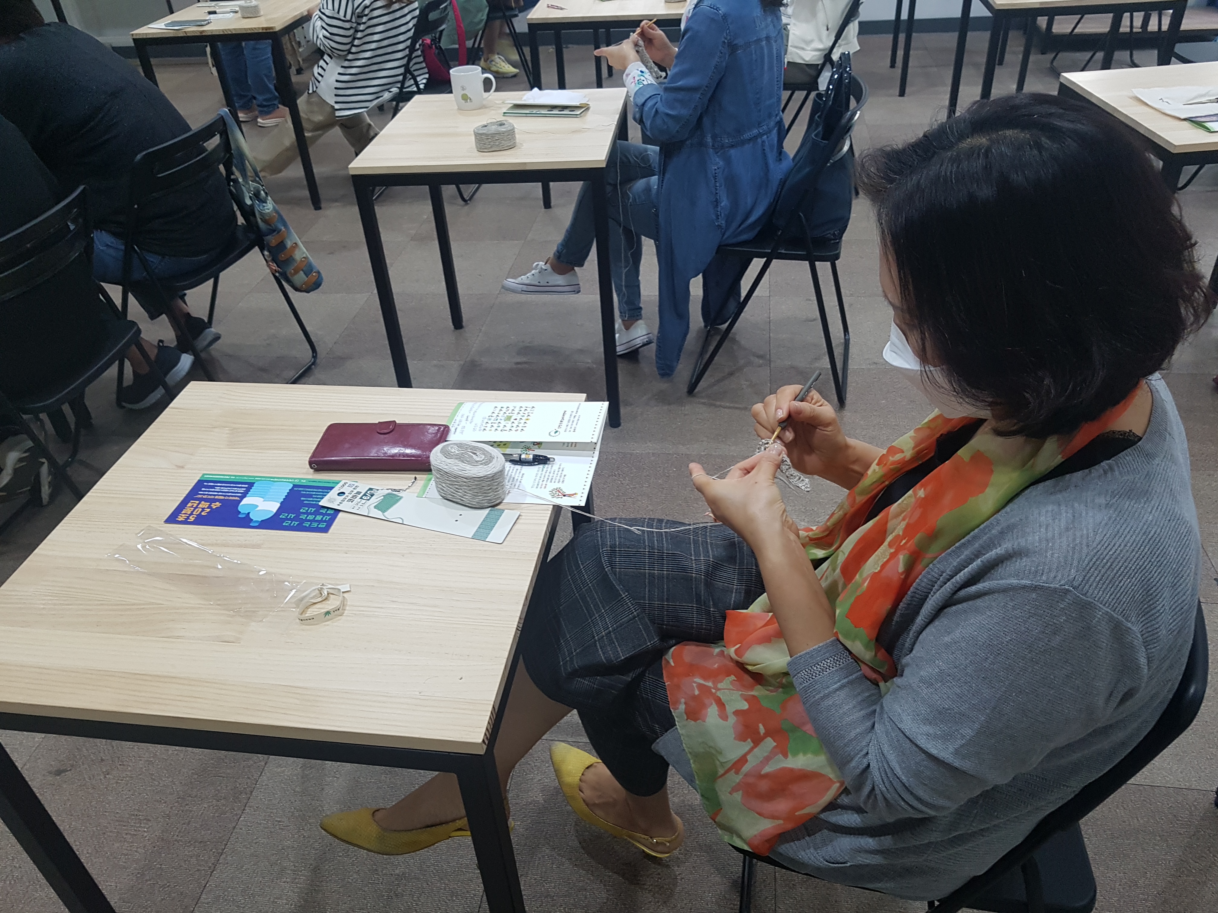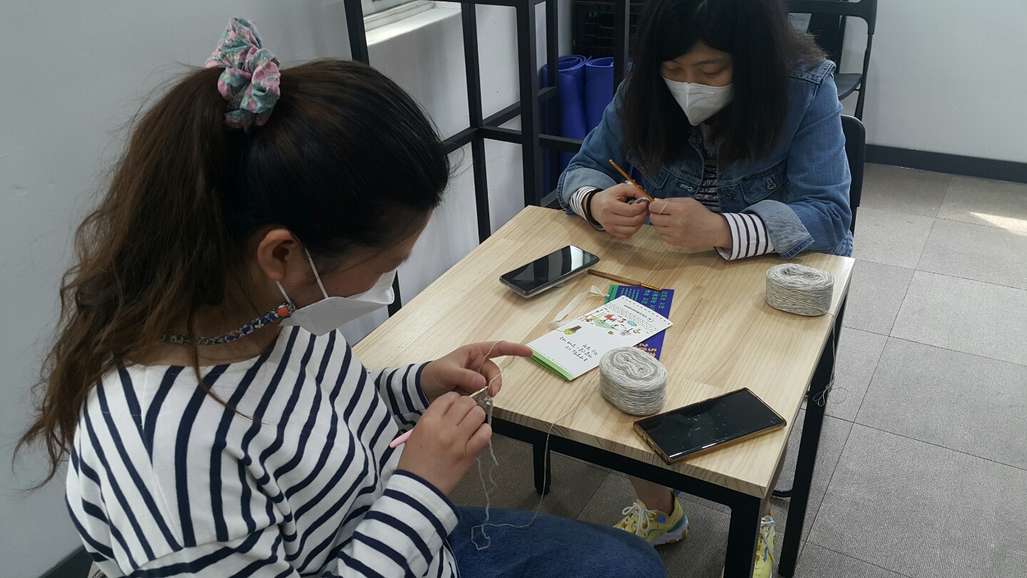 봄지락 꼼지락 2강, 오늘은 삼베실로 수세미를 함께 떴습니다. 사진만 보면 이미 타샤 튜더들이시지만 수세미로 가는 길은 생각보다 험난했다는 사실...!