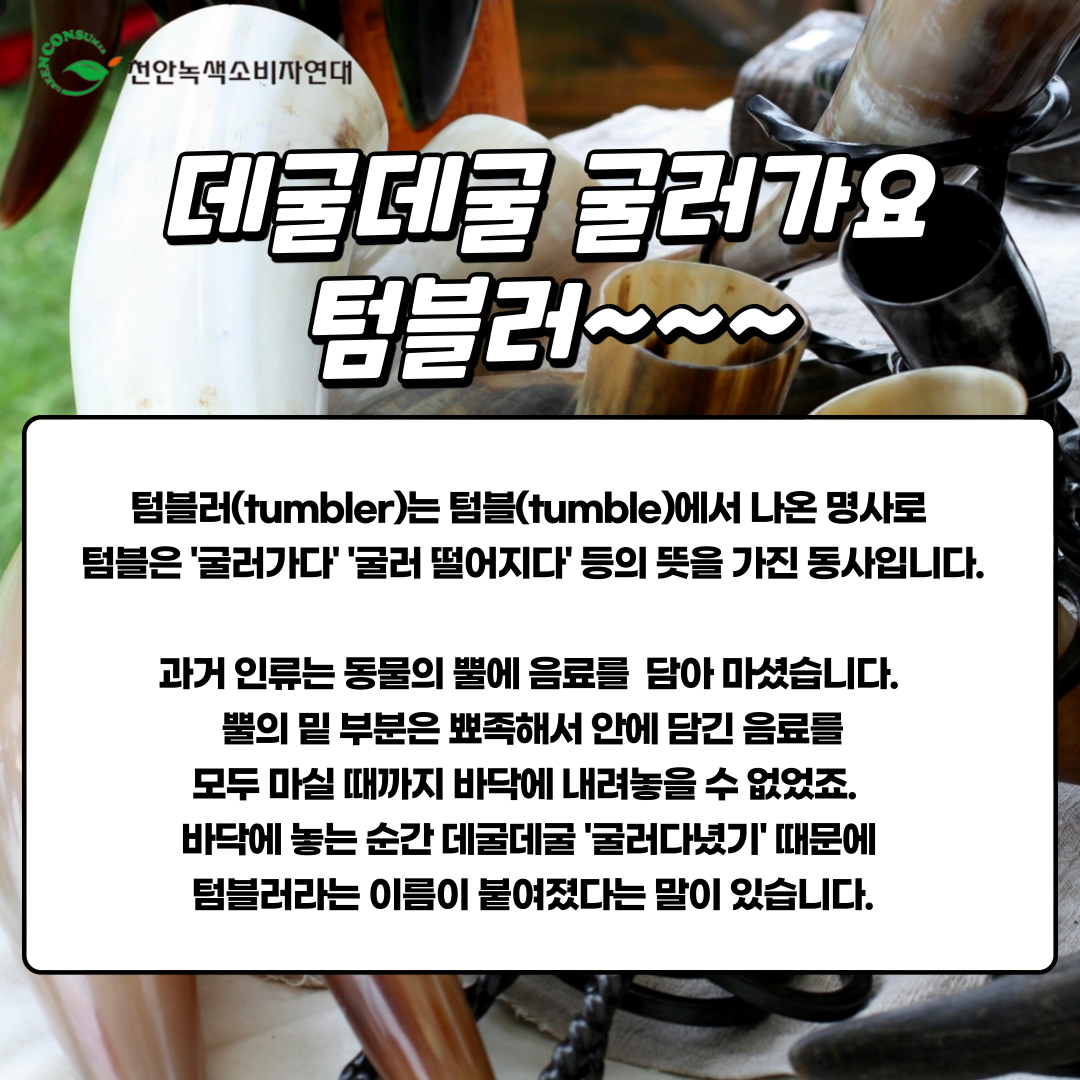 텀블러(tumbler)는 텀블(tumble)에서 나온 명사로 텀블은 ‘굴러가다’ ‘굴러 떨어지다’ 등의 뜻을 가진 동사입니다. 과거 인류는 동물의 뼈에 음료를 담아 마셨습니다. 뿔의 밑 부분은 뾰족해서 안에 담긴 음료를 모두 마실 때까지 바닥에 내려놓을 수 없었죠. 바닥에 놓는 순간 데굴데굴 ‘굴러다녔기’ 때문에 텀블러라는 이름이 붙여졌다는 말이 있습니다.