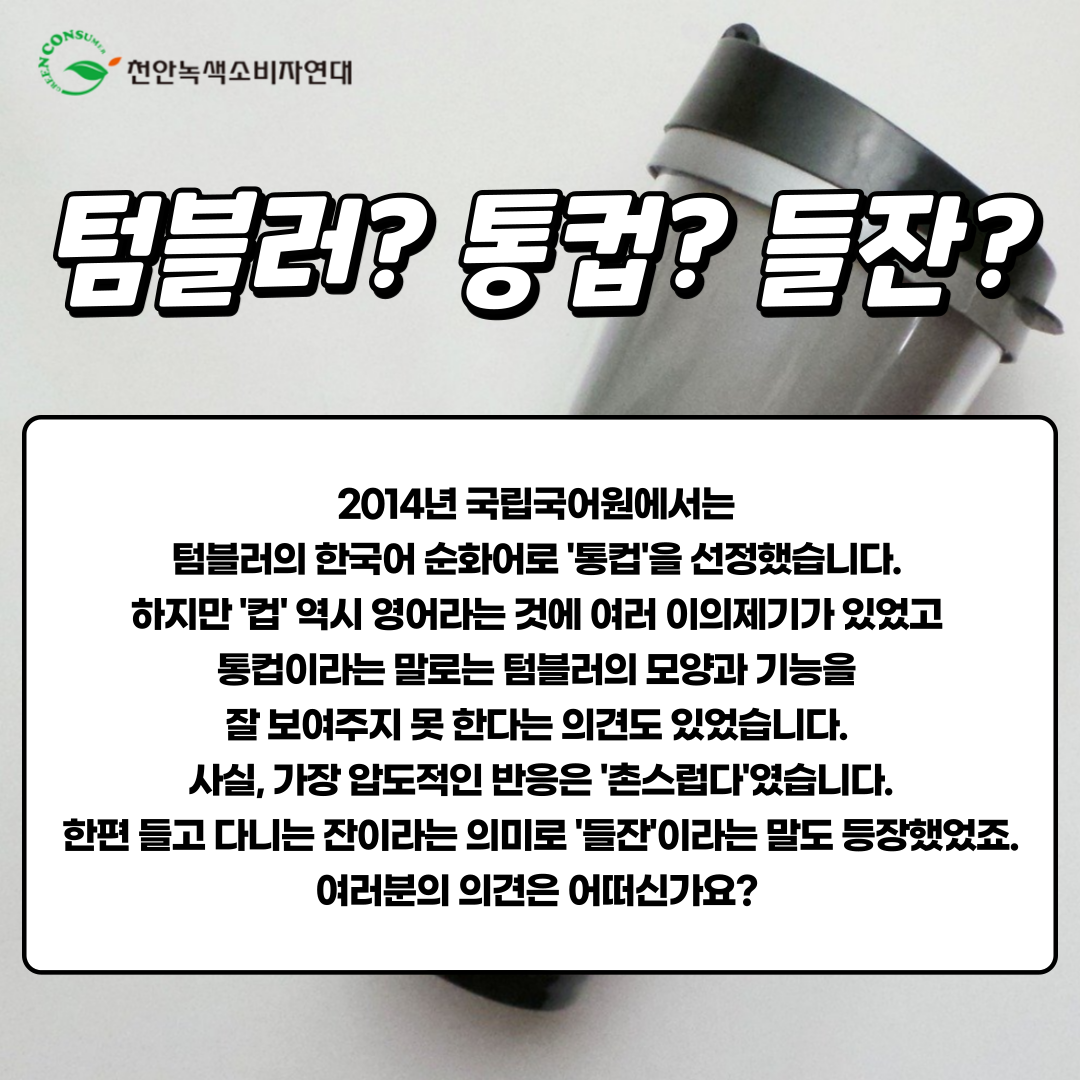 한편 2013년 국립국어원에서는 텀블러의 한국어 순화어로 ‘통컵’을 선정했습니다. 하지만 ‘컵; 역시 영어라는 것에 여러 이의제기가 있었고 통컵이라는 말로는 텀블러의 모양과 기능을 잘 보여주지 못 한다는 의견도 있었습니다.