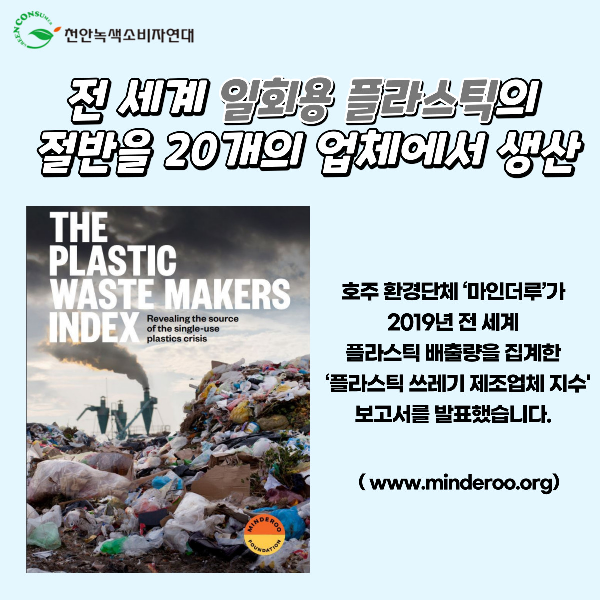 호주 환경단체 ‘마인더루’기 2019년 전 세계 플라스틱 배출량을 집계한 ‘플라스틱 쓰레기 제조업체 지수 보고서’를 발표했습니다.