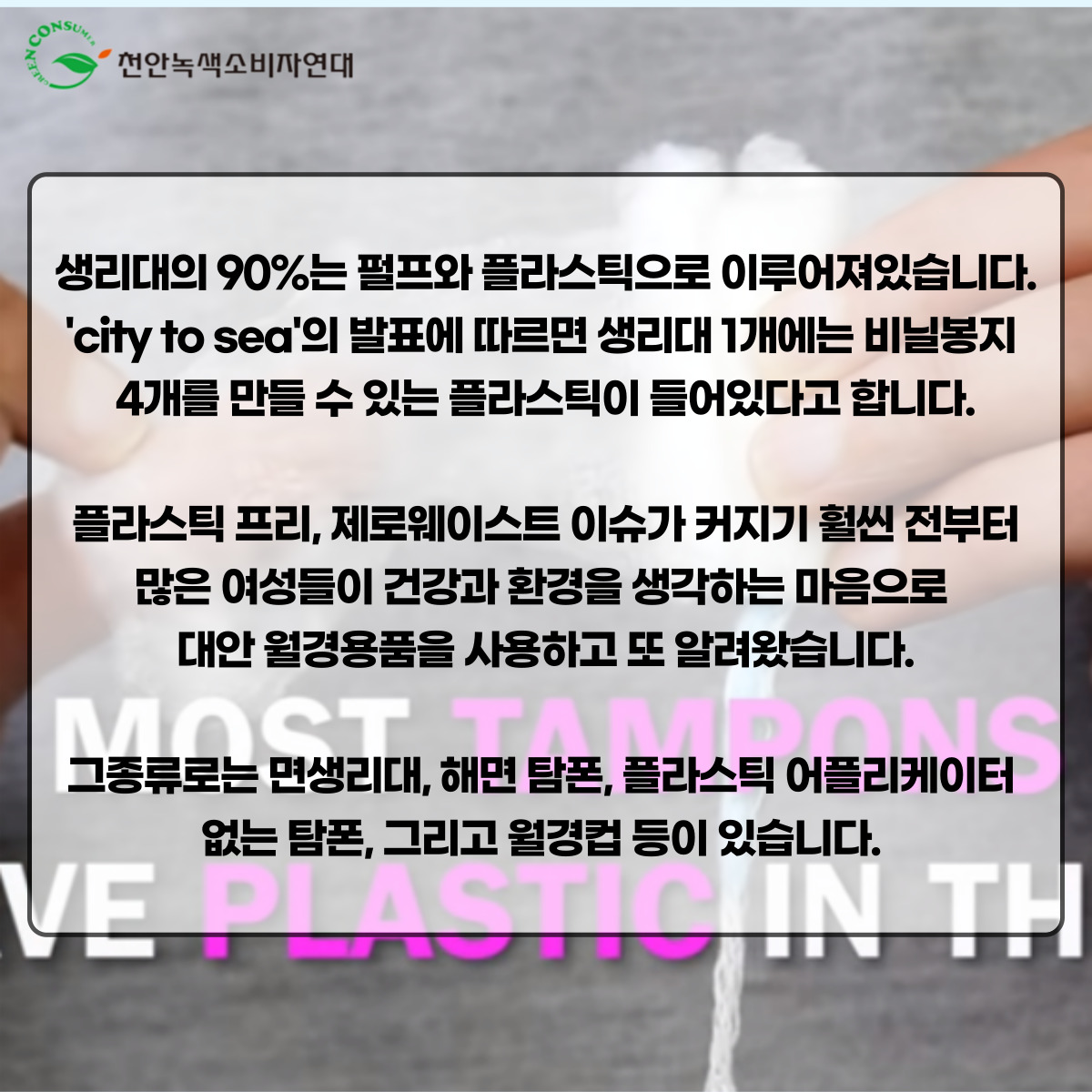 생리대의 90%는 펄프와 플라스틱으로 이루어져있습니다.