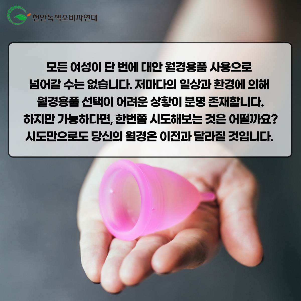 모든 여성이 단 번에 대안 월경용품 사용으로 넘어갈 수는 없습니다. 저마다의 일상과 환경에 의해 월경용품 선택이 어려운 상황이 분명 존재합니다. 하지만 가능하다면, 한번쯤 시도해보는 것은 어떨까요? 시도만으로도 당신의 월경은 이전과 달라질 것입니다.