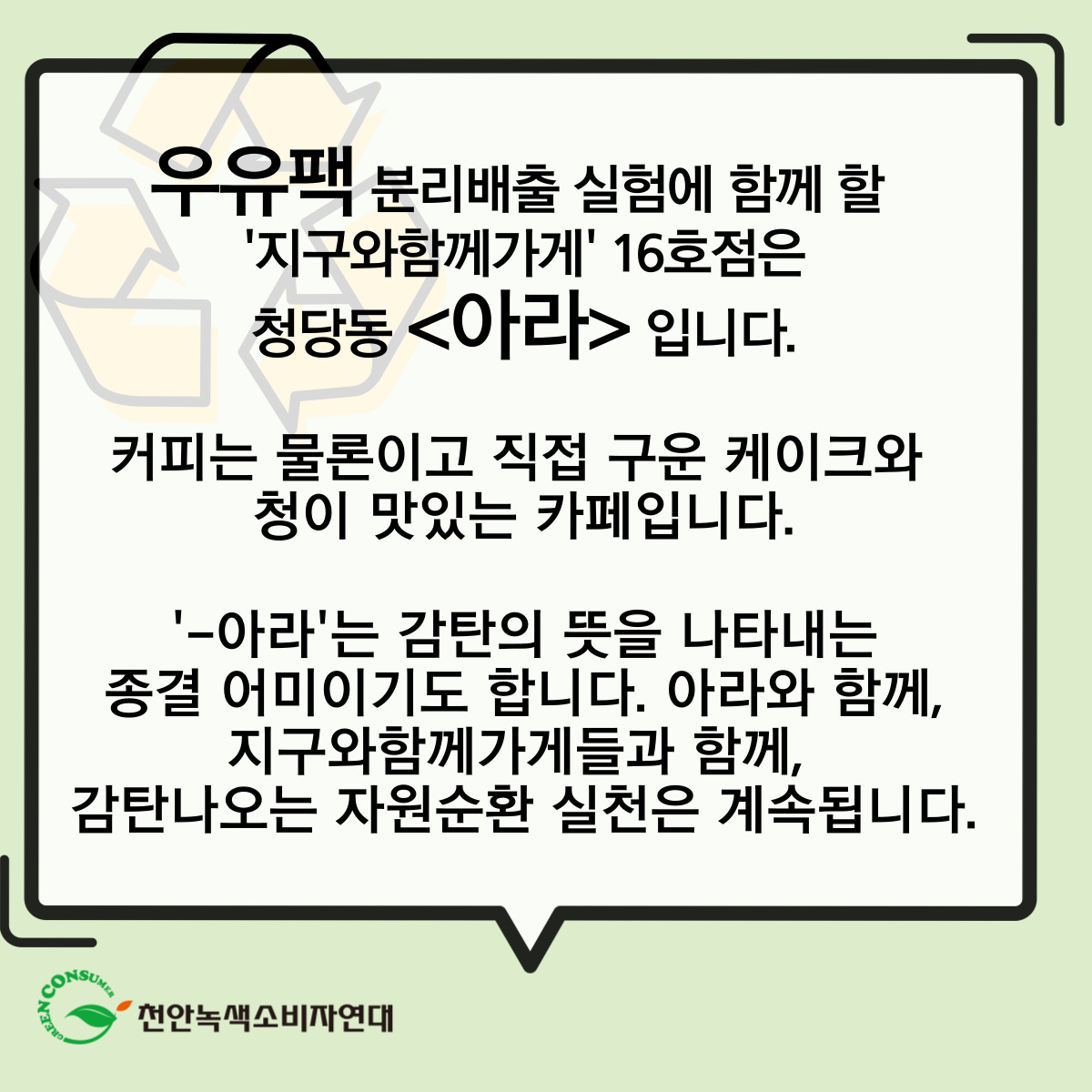 우유팩 분리배출 실험에 함께 할 ‘지구와함께가기’ 16호점은 청당동 <아라>입니다. 커피는 물론이고 직접 구운 케이크와 청이 맛있는 카페입니다. 붉은 벽돌의 외관과 통유리 전경이 인상적인 곳입니다.