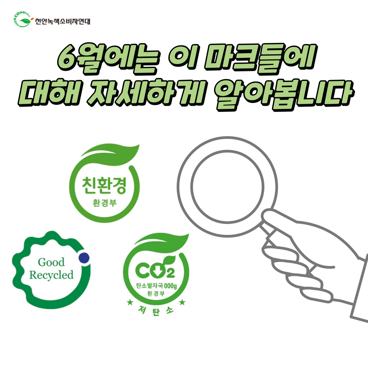 6월 5일 환경의 날을 기념하는 6월의 실천 주제는 <친환경인증 제품>입니다. 내가 사용하고 있는 제품 중 인증 마크가 부착된 것 찾아보기, 물품을 구매하게 된다면 친환경 인증 제품 선택하기로 환경의 날을 함께 기념해주세요.