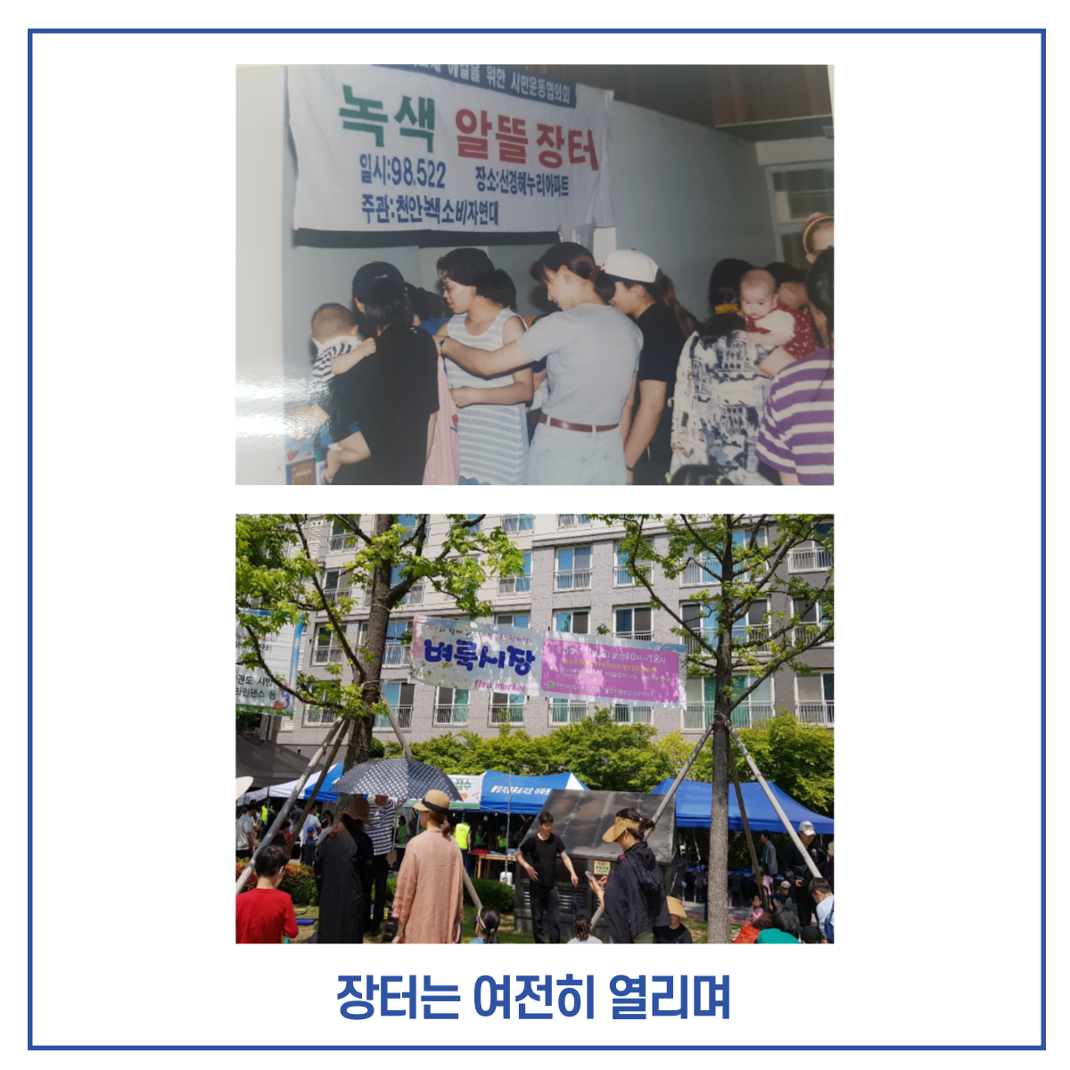 버스가 바뀌고, 교복이 바뀌는 동안에도 장터는 여전히 열리며 우리는 여전히 자연의 일부이며 그때도 지금도 그것을 지켜가고 있습니다. 날이 맑을 때에도, 날이 궂을 때에도 여러분의 삶 어느 시절에서는 언제나 함께 하는 천안녹색소비자연대가 되겠습니다.