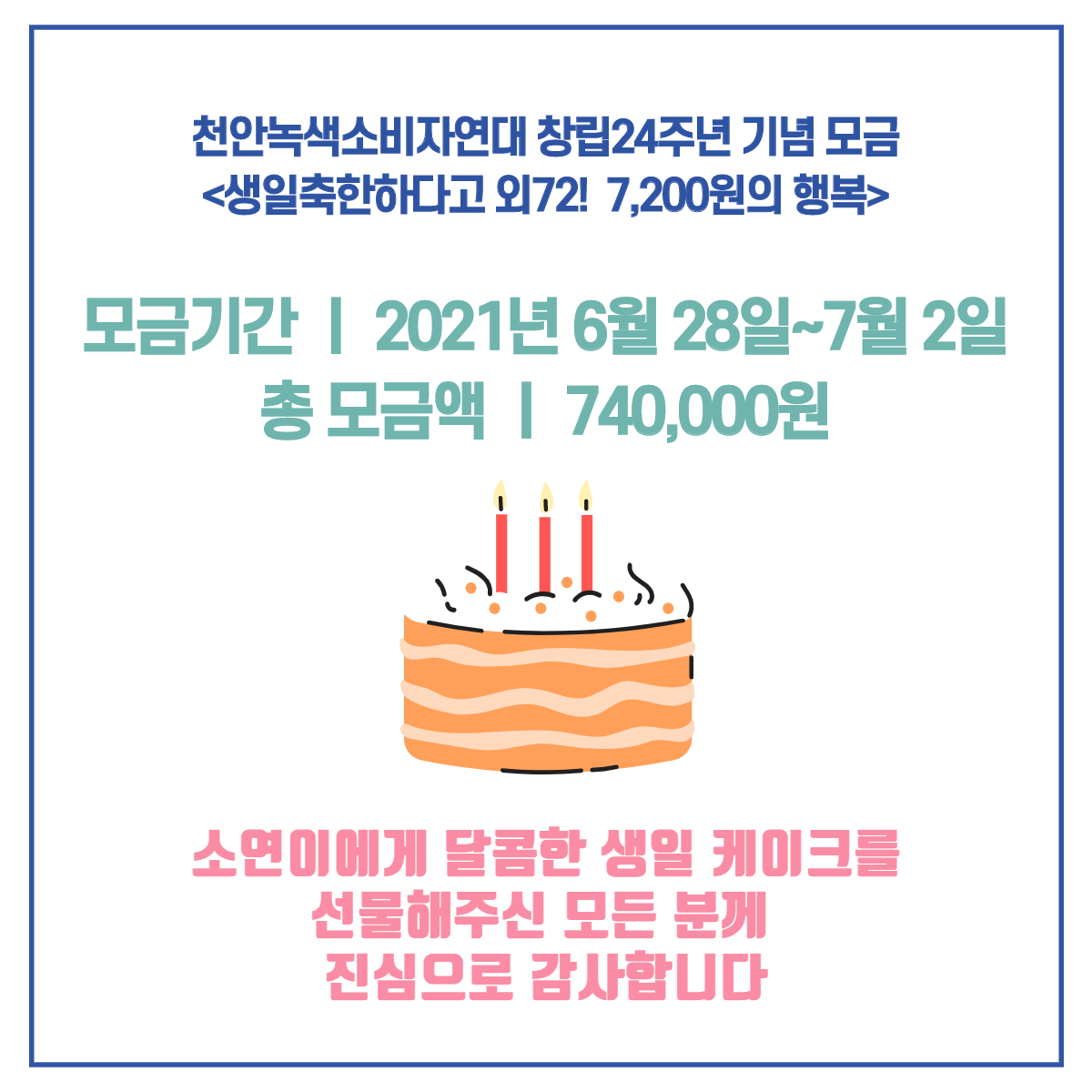 조각 케이크가 아니라 5단 케이크 몇 개도 사먹을 수 있겠쥬?천안녹색소비자연대 창립 24주년 기념 모금이 달콤하고 또 따뜻하게 마무리되었습니다. 관심과 참여로 함께 해주신 모든 분들 감사합니다.